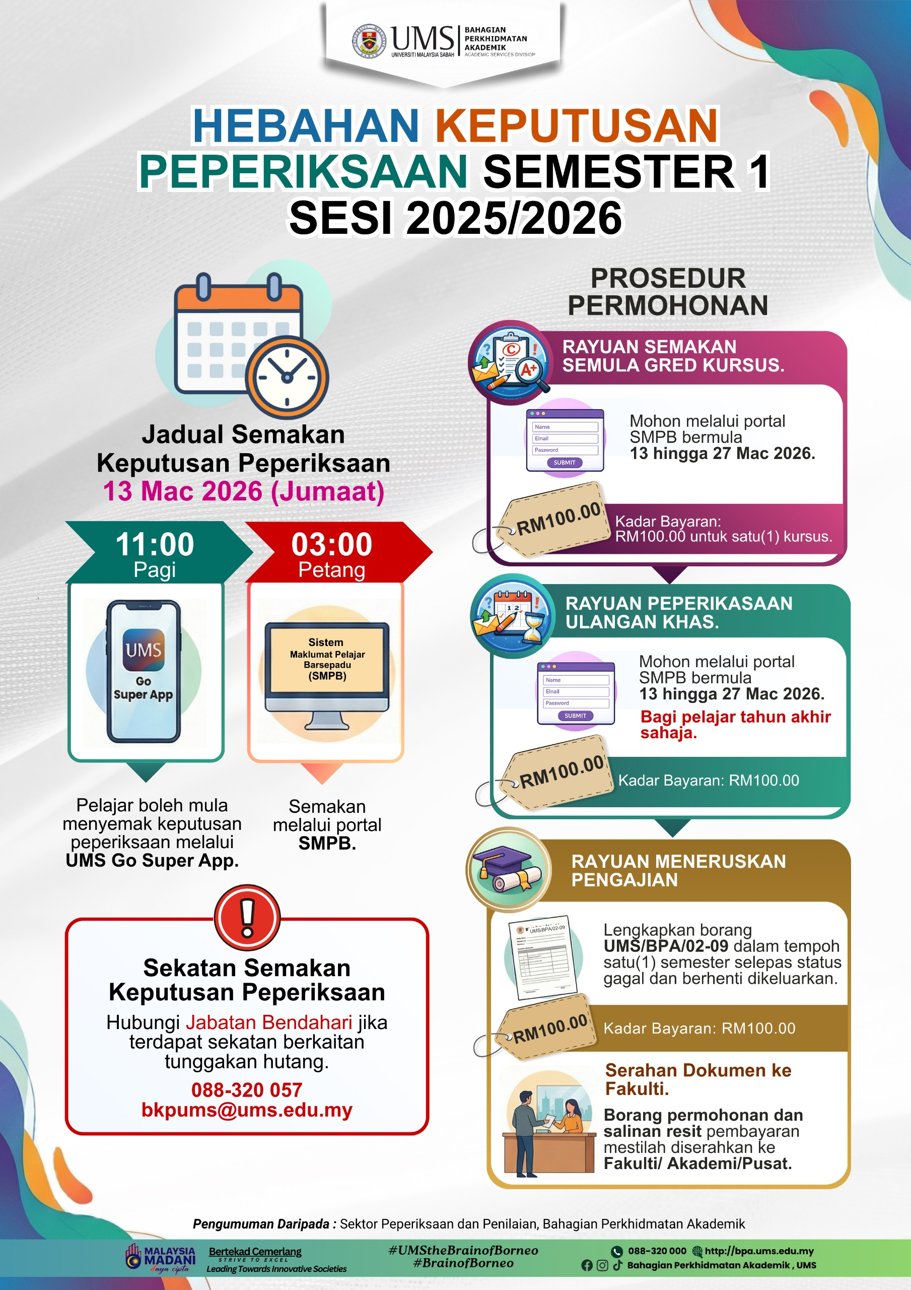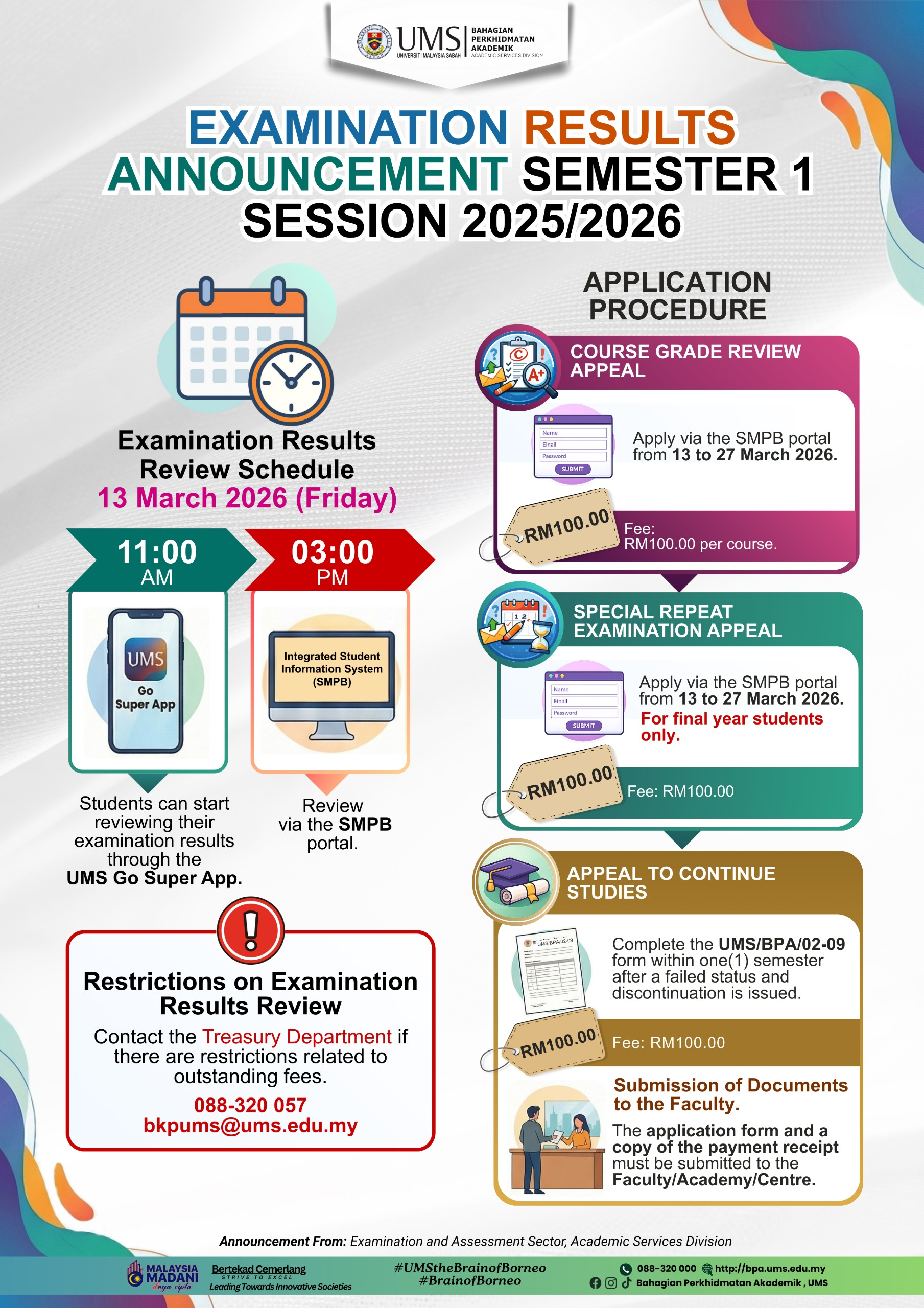 The Examination Results Semester 1, 2025/2026 session for undergraduate studies can be accessed starting on 13 March 2026 (Friday) via the following link:-
