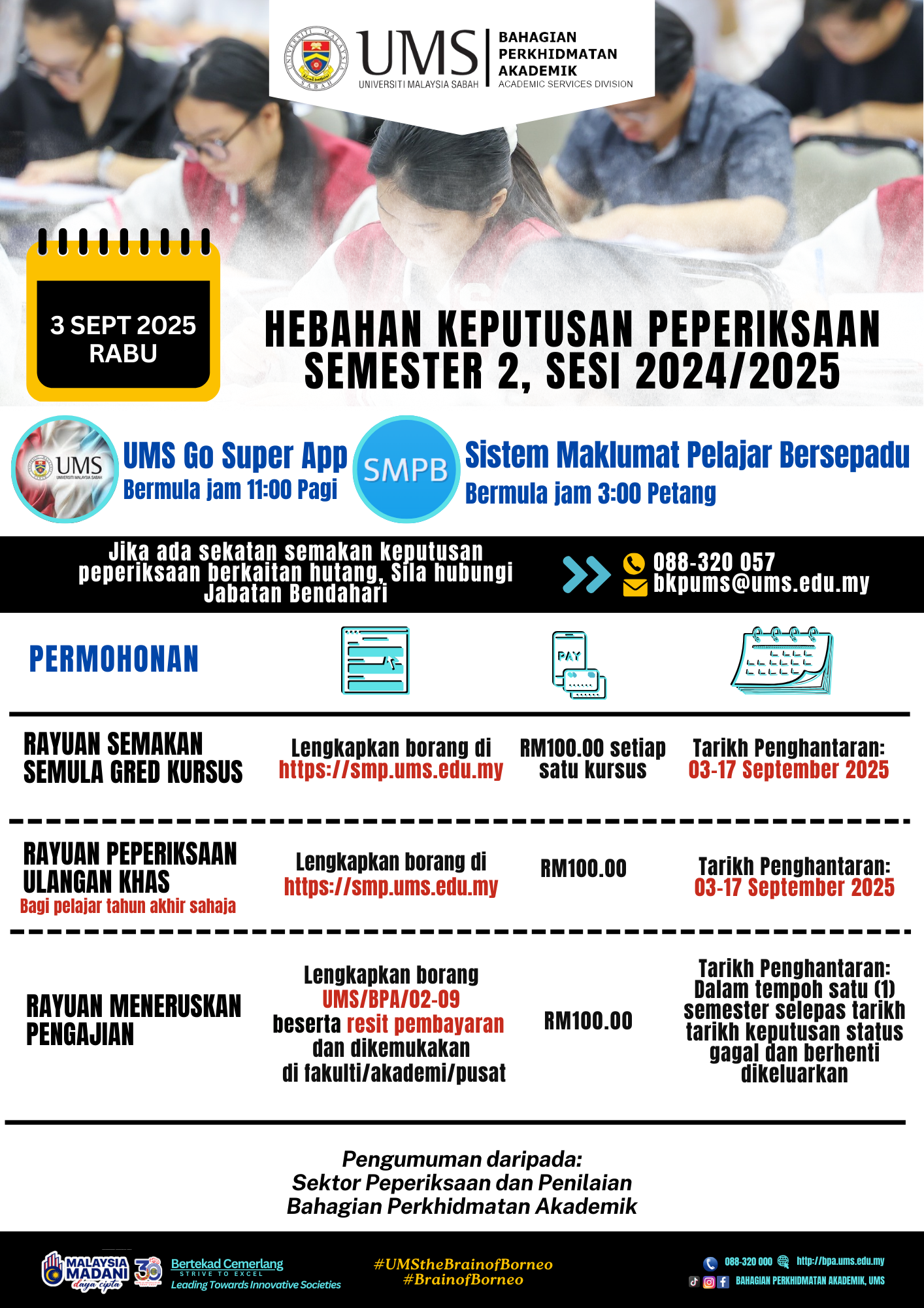 The Examination Results Semester 2, 2024/2025 session for undergraduate studies can be accessed starting on 3 September ๐๐๐๐ (Wednesday) via the following link:-