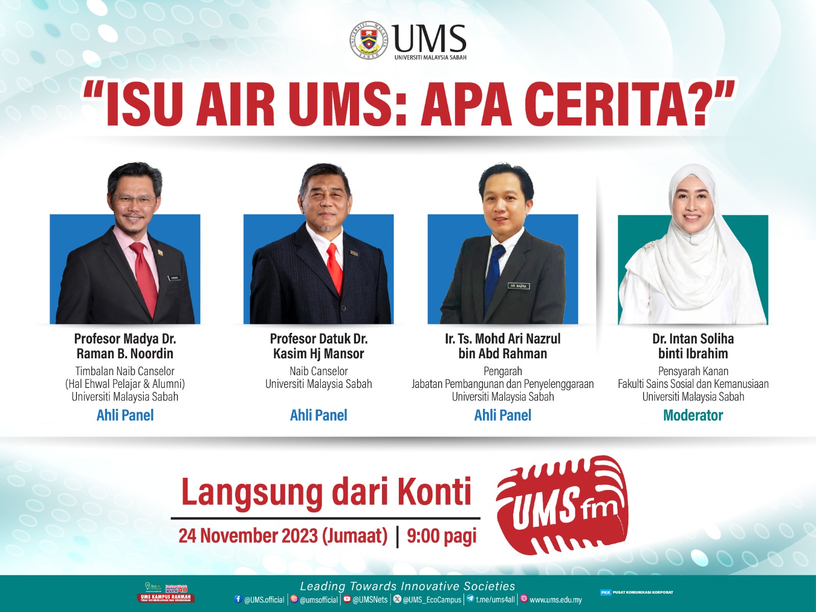 Warga UMS dipelawa untuk mendengar "Isu Air UMS: Apa Cerita?" menerusi UMSfm 91.1fm serta boleh ikuti di Facebook Live dan TikTok Live UMSfm dengan menampilkan tetamu undangan Naib Canselor UMS, Timbalan Naib Canselor (Hal Ehwal Pelajar dan Alumni) dan Pengarah Jabatan Pembangunan dan Penyelenggaraan pada 24 Nov 2023, pukul 9.00 pagi.
