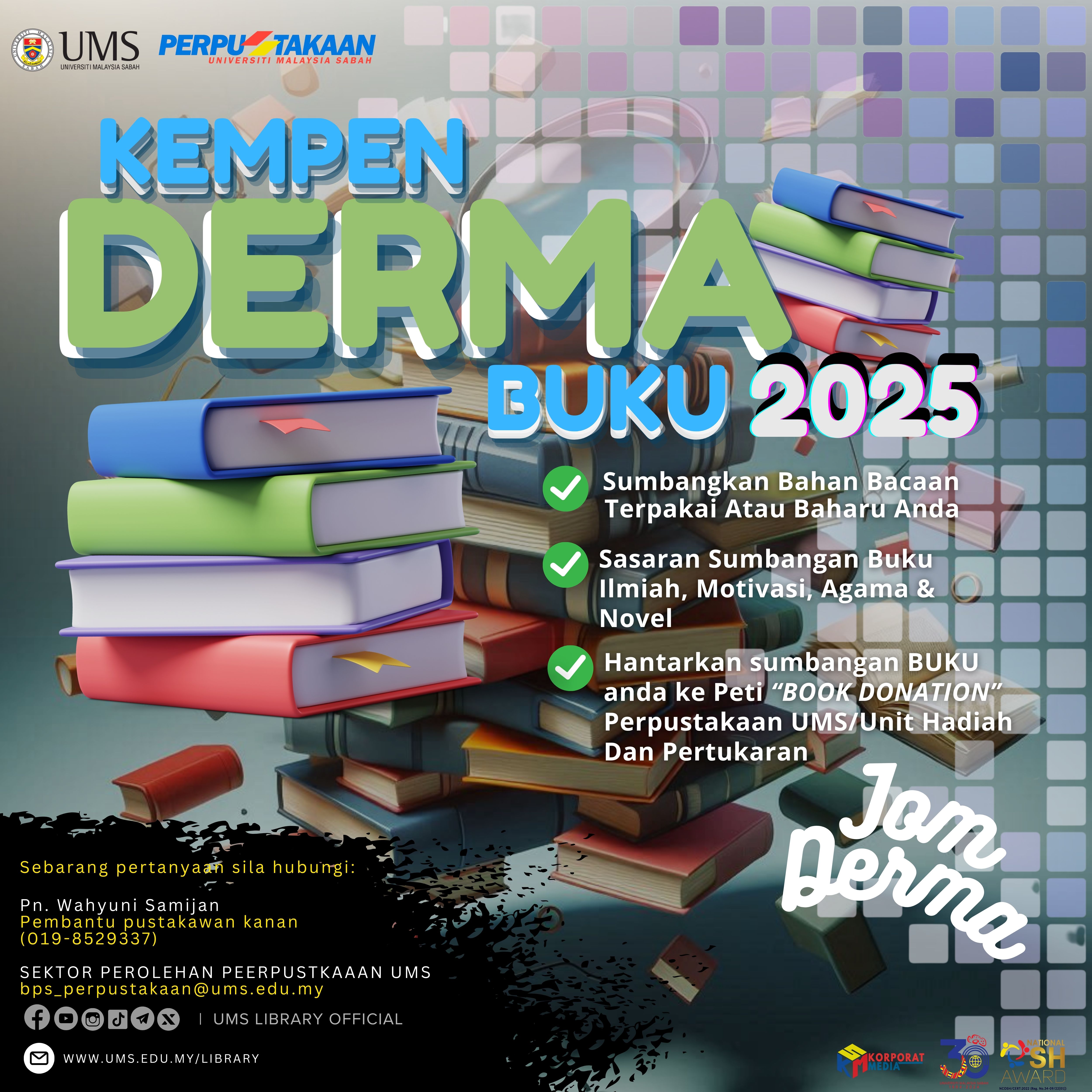 Perpustakaan UMS menjalankan Kempen Derma Buku 2025 sama ada sumbangan bahan bacaan terpakai atau baharu. Buku Ilmiah, motivasi, agama atau novel.