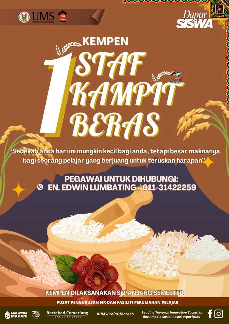 Kempen ini menggalakkan setiap staf UMS untuk menyalurkan sumbangan berupa sekampit beras atau sumbangan tunai bagi tujuan pengisian Dapur Siswa. Sumbangan kecil anda amat bermakna dalam memastikan kebajikan pelajar sentiasa terpelihara.