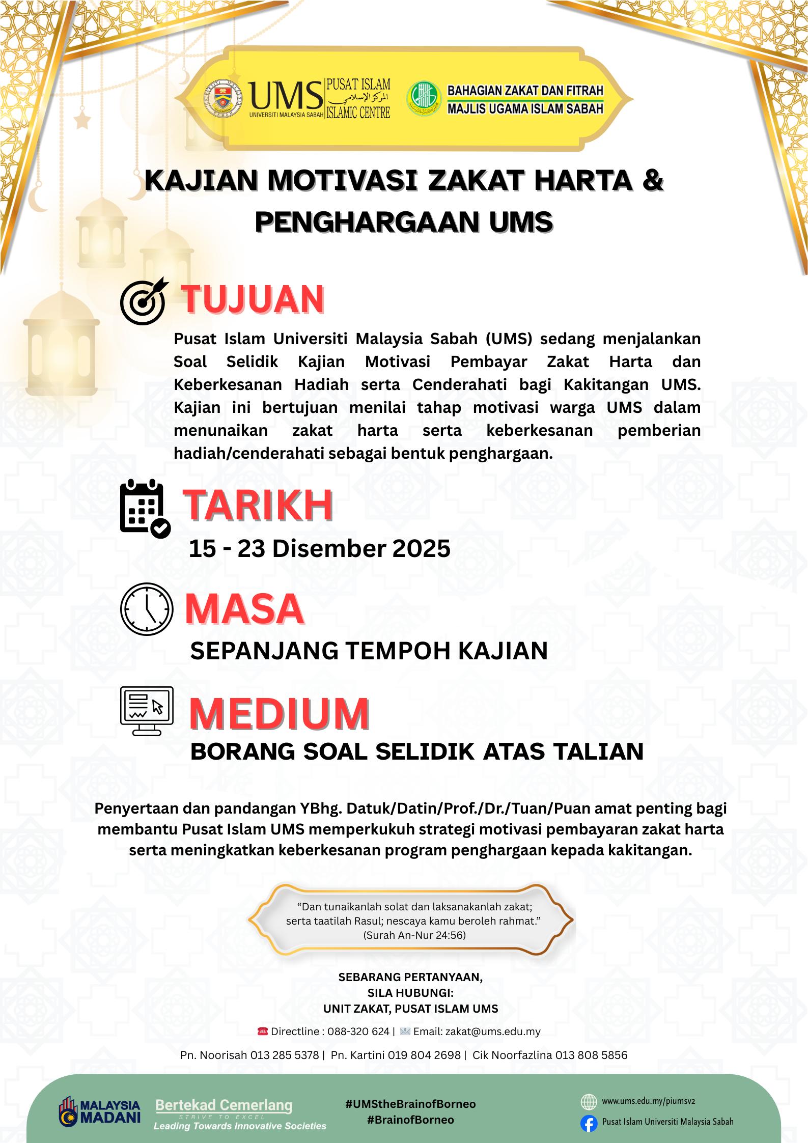 Pusat Islam Universiti Malaysia Sabah (UMS) sedang menjalankan Soal Selidik Kajian Motivasi Zakat Harta & Penghargaan UMS. Kajian ini bertujuan menilai tahap motivasi warga UMS dalam menunaikan zakat harta serta keberkesanan pemberian hadiah/cenderahati sebagai bentuk penghargaan.