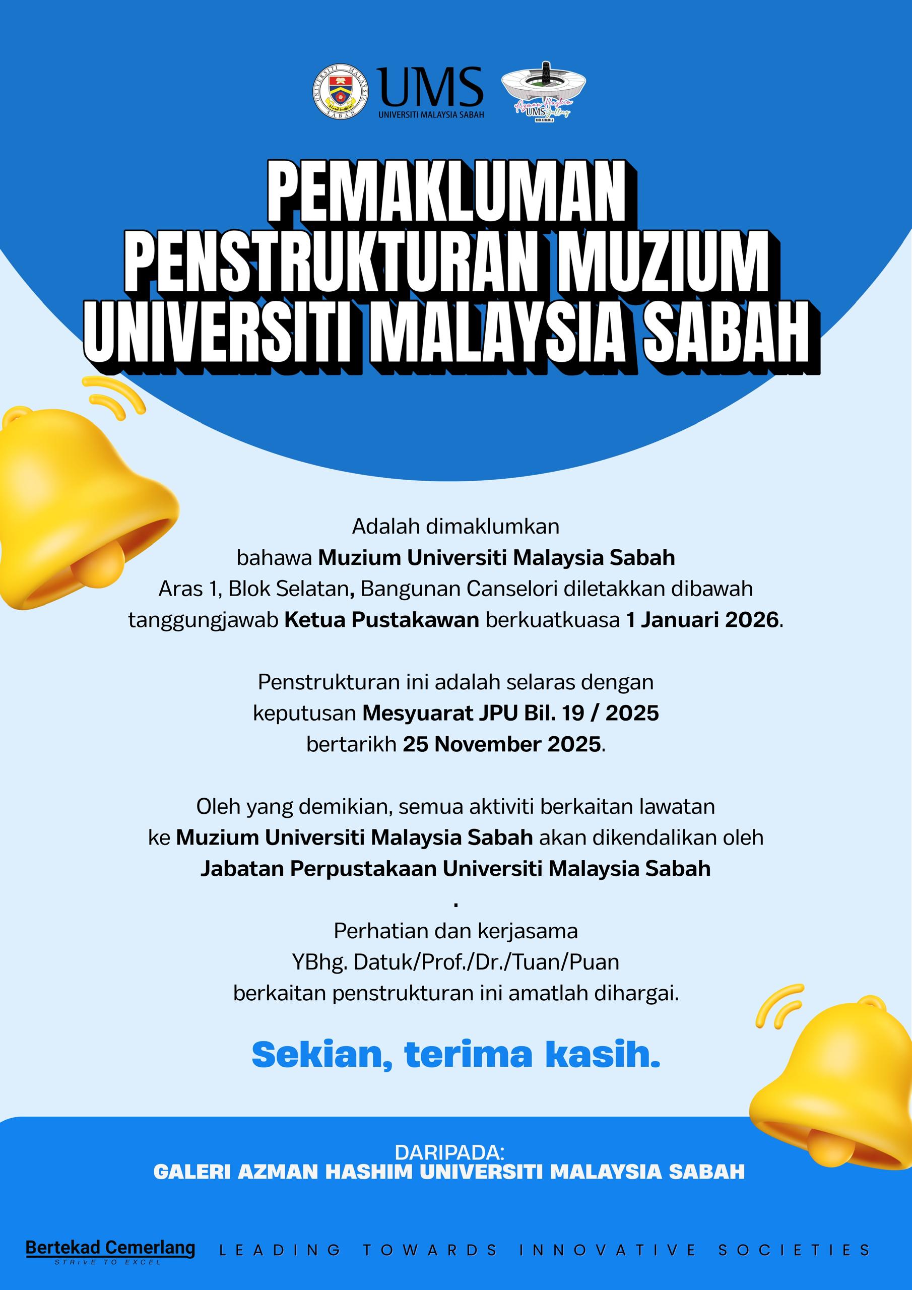13 Januari 2026 Jumlah paparan: 213 Makluman Penstrukturan Muzium Universiti Malaysia Sabah Cetak Emel Pengumuman Daripada: Galeri Azman Hashim UMS