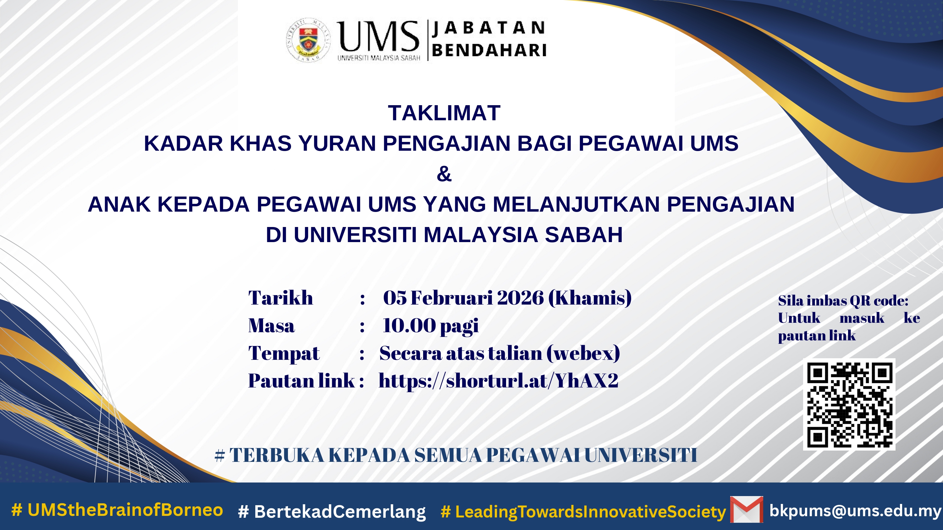 Sukacita dimaklumkan bahawa Taklimat Kadar Khas Yuran Pengajian Bagi Pegawai UMS Dan Anak Kepada Pegawai UMS Yang Melanjutkan Pengajian Di Universiti Malaysia Sabah akan diadakan seperti ketetapan berikut: