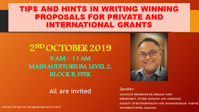 SUBJEK: TAKLIMAT ‘TIPS AND HINTS IN WRITING WINNING PROPOSALS FOR PRIVATE AND INTERNATIONAL GRANTS