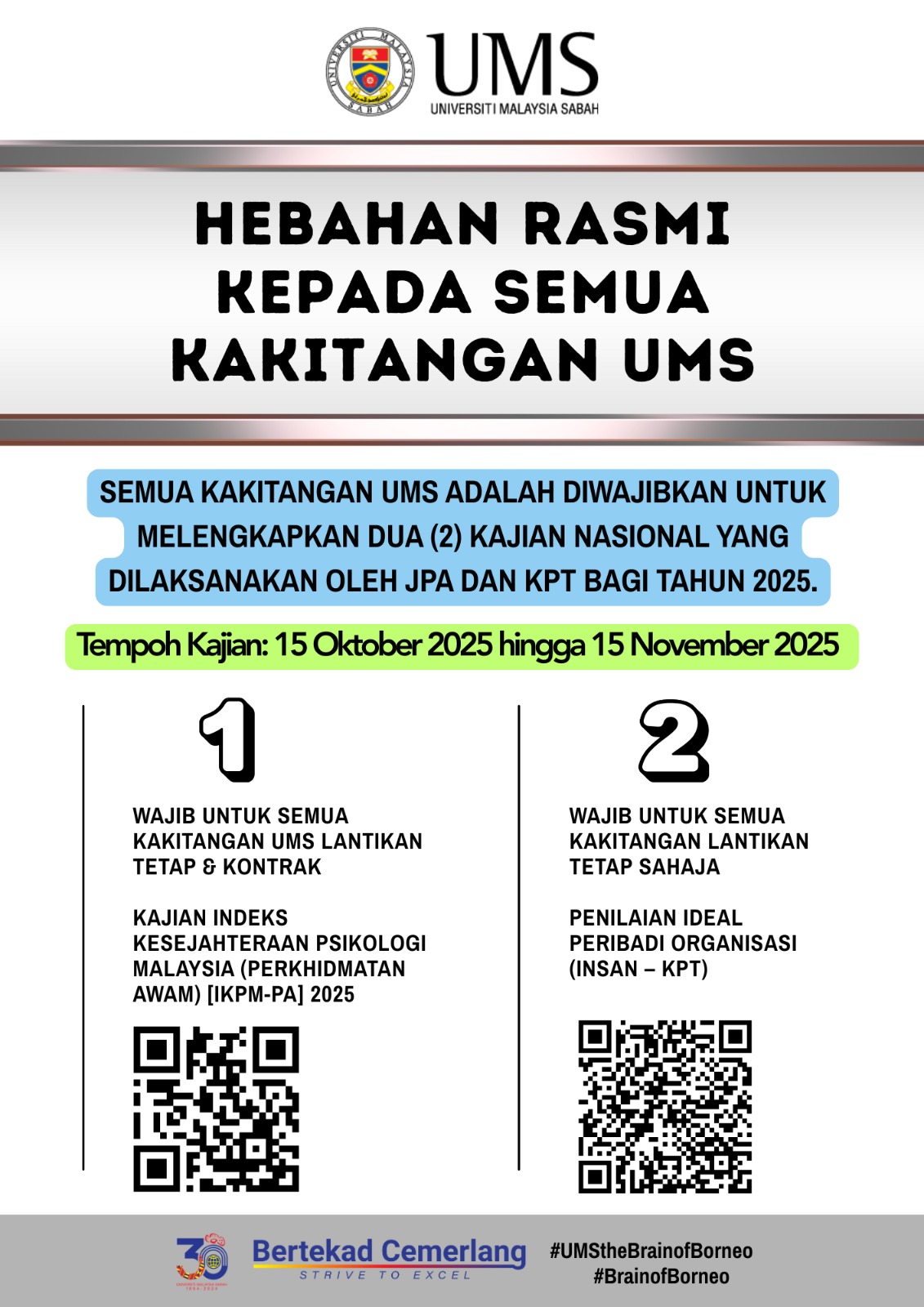 Dimaklumkan bahawa semua kakitangan Universiti Malaysia Sabah (UMS) adalah DIWAJIBKAN untuk melengkapkan dua (2) kajian nasional yang dilaksanakan oleh Jabatan Perkhidmatan Awam (JPA) dan Kementerian Pendidikan Tinggi (KPT) bagi tahun 2025 seperti berikut:
