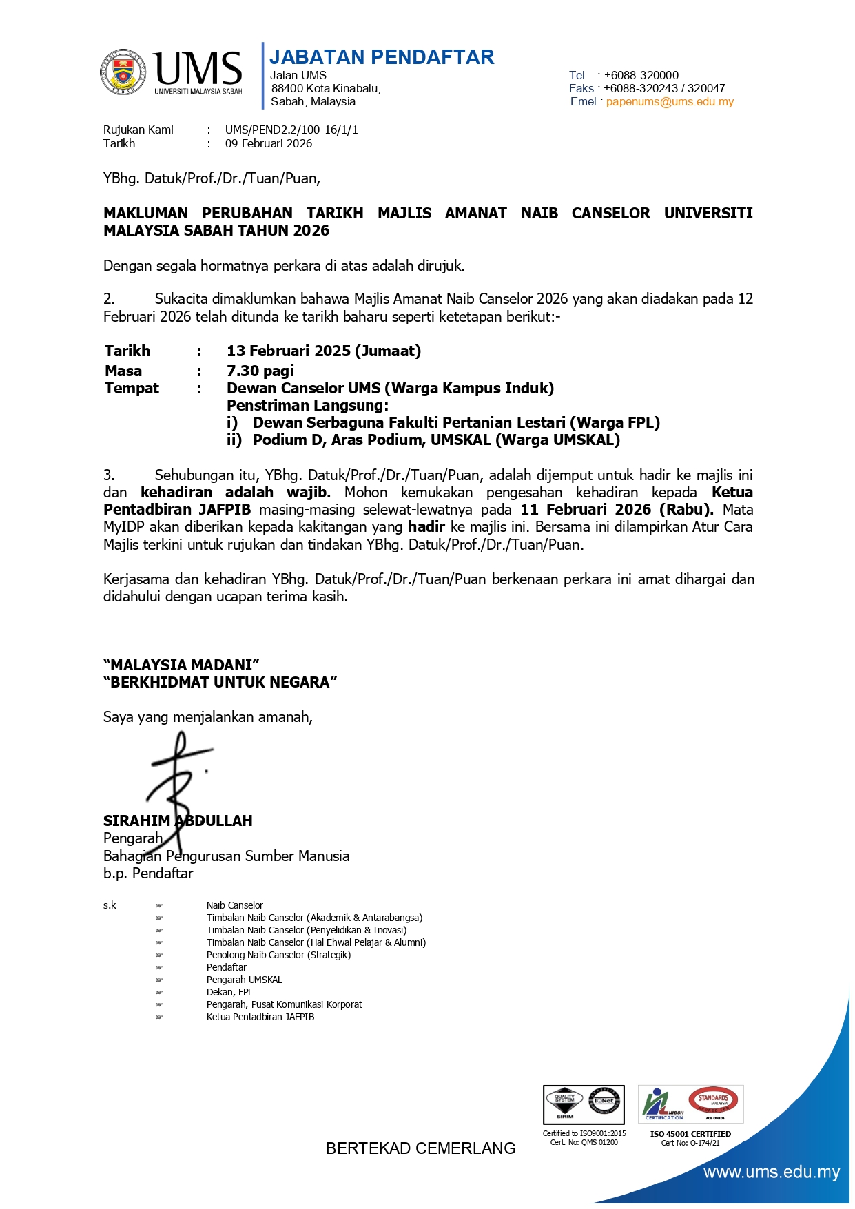 | SURAT MAKLUMAN PERUBAHAN TARIKH MAJLIS AMANAT NAIB CANSELOR UMS TAHUN 2026 |