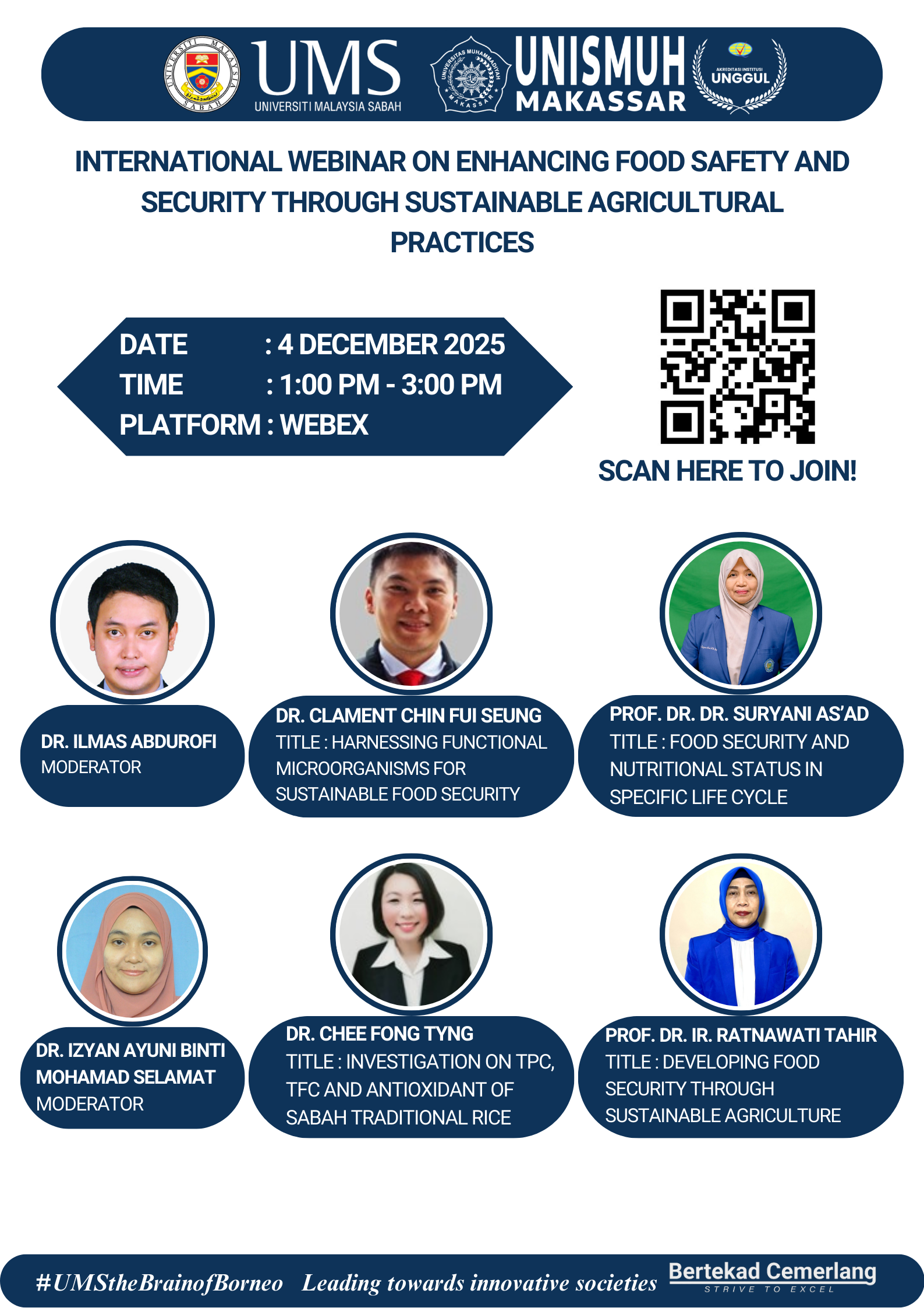 Pihak Fakulti Pertanian Lestari (FPL), Universiti Malaysia Sabah (UMS) menjemput semua warga UMS, untuk menyertai program webinar international “Enhancing Food Safety and Security through Sustainable Agricultural Practices” yang dianjurkan oleh Fakulti Pertanian Lestari (FPL) dengan kerjasama Universitas Muhammadiyah Makassar (Unismuh Makassar), pada ketetapan berikut: