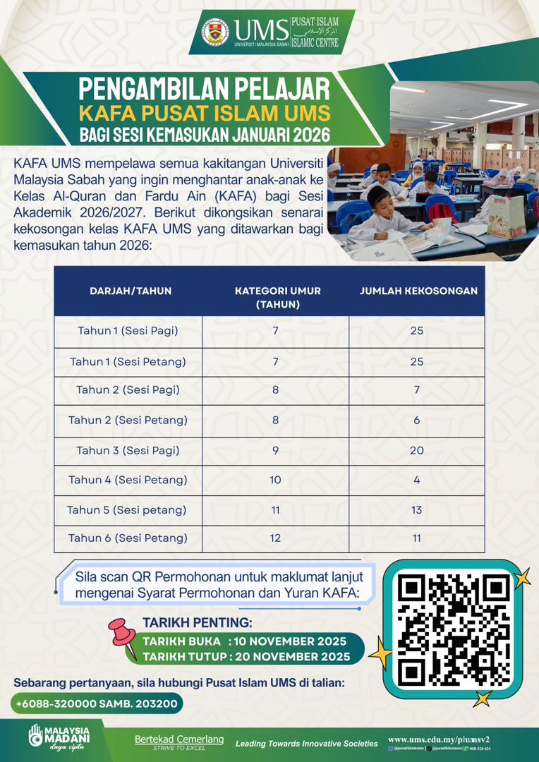 Pusat Islam Universiti Malaysia Sabah mempelawa anak-anak kakitangan UMS dan masyarakat awam untuk menyertai Kelas Al-Quran dan Fardu Ain (KAFA) bagi Sesi Akademik 2026/2027.