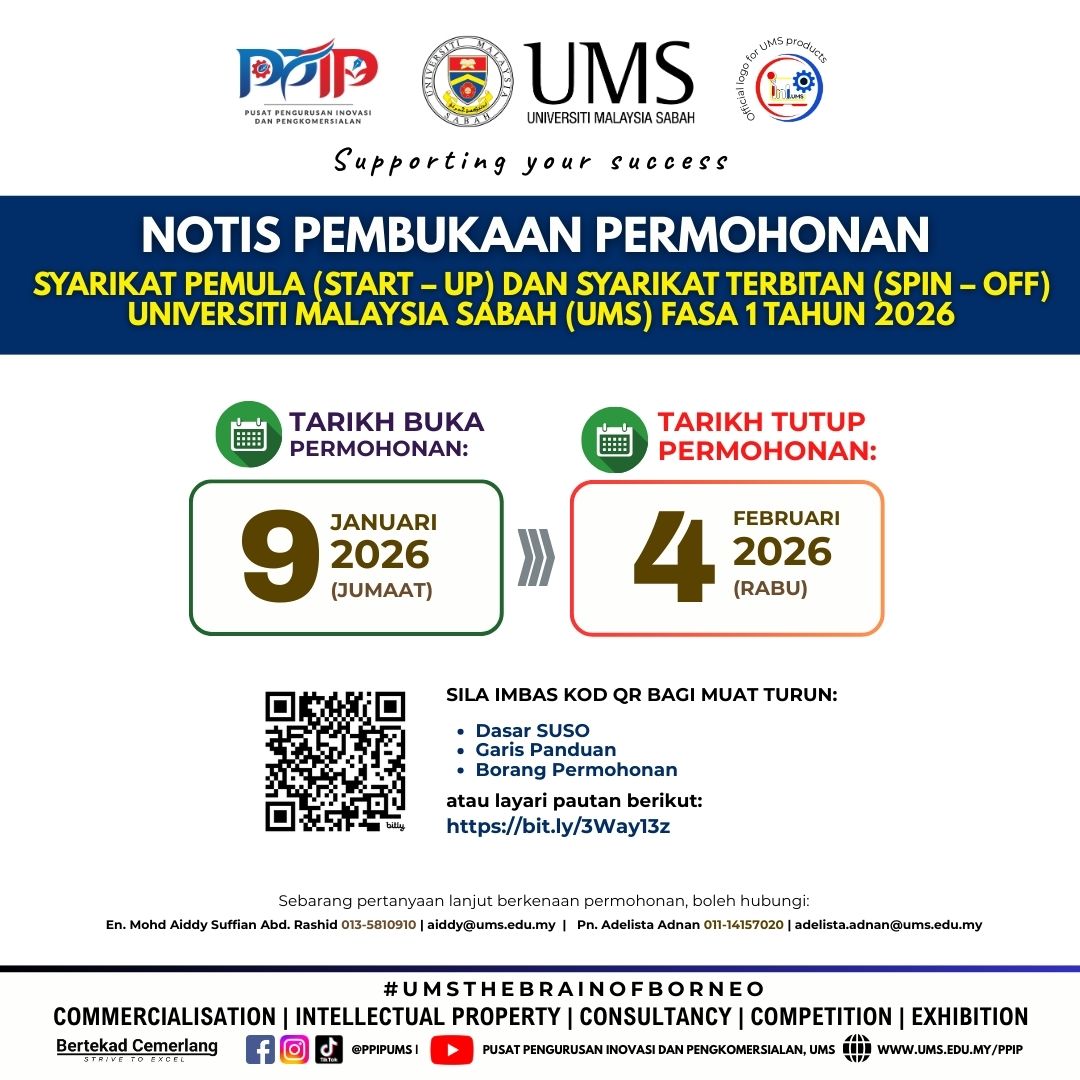 Dimaklumkan bahawa permohonan Penubuhan Syarikat Pemula (Start-Up) dan Syarikat Terbitan (Spin-Off) Universiti Malaysia Sabah (UMS) bagi Fasa 1 Tahun 2026 dibuka seperti ketetapan berikut: