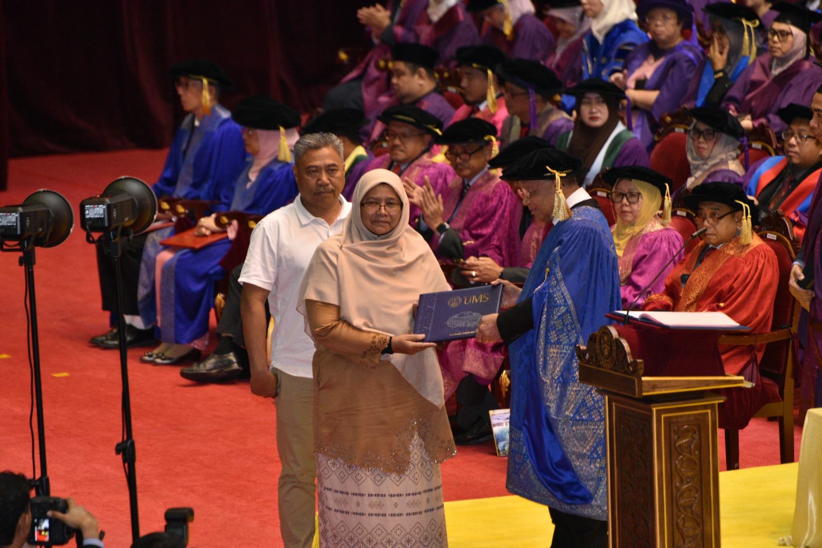 Suasana Majlis Konvokesyen Universiti Malaysia Sabah (UMS) bertukar sayu apabila pasangan ibu bapa naik ke pentas untuk menerima skrol ijazah Anumerta bagi pihak Allahyarhamah Farah Hasanah Abdul Jaid @ Abdul Kaid sebagai tanda penghormatan terakhir.