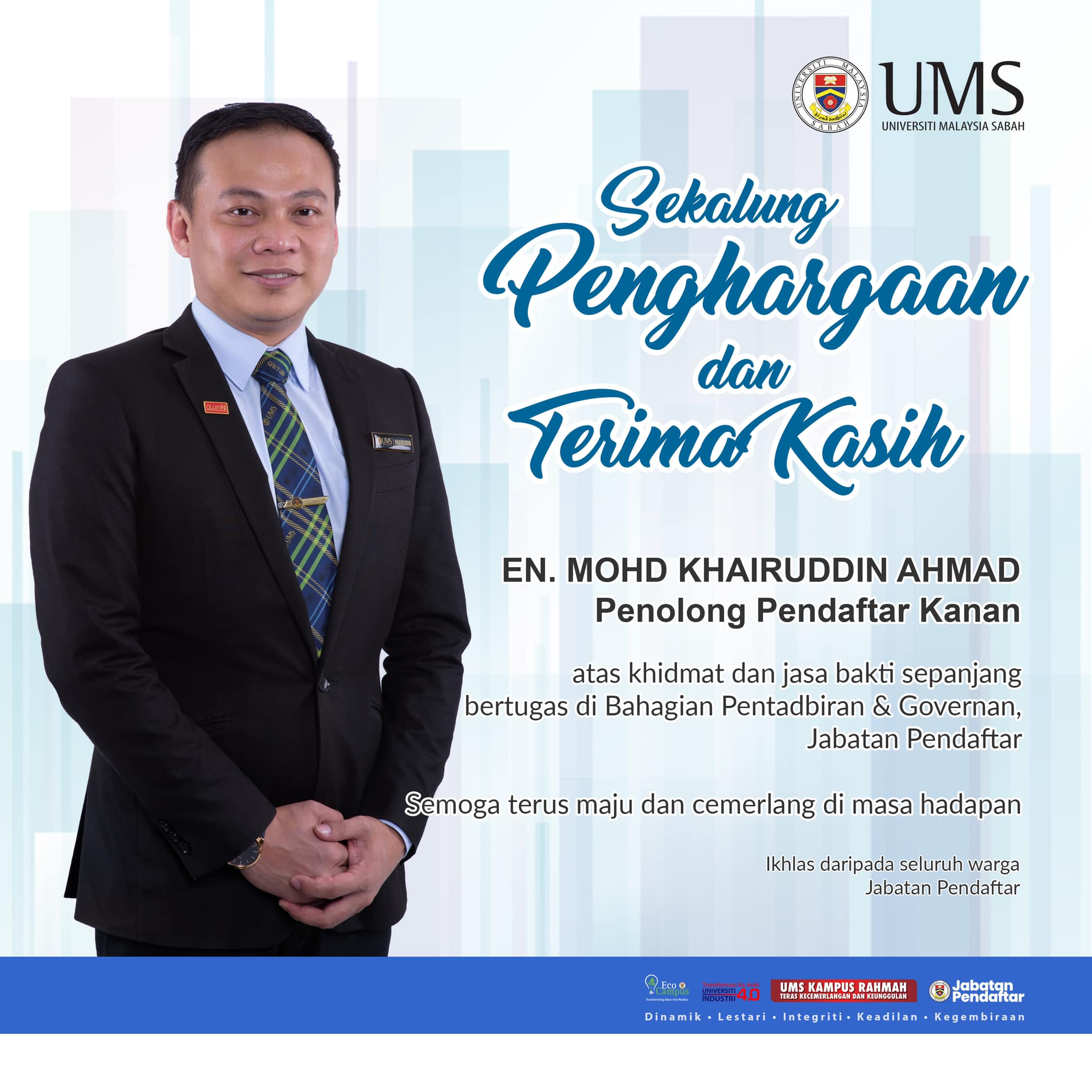 Sekalung penghargaan dan terima kasih diucapkan kepada En. Mohd Khairuddin Ahmad, Penolong Pendaftar Kanan atas khidmat dan jasa bakti sepanjang bertugas di Bahagian Pentadbiran & Governan Jabatan Pendaftar.