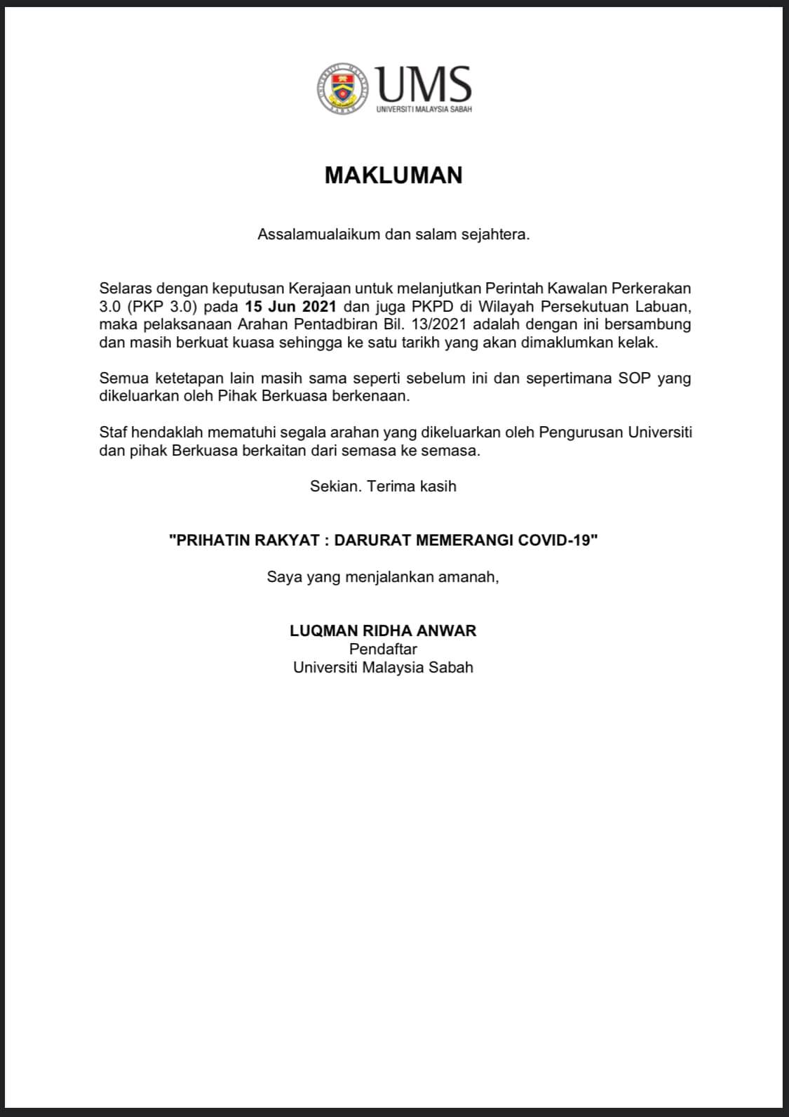 Makluman Arahan Pentadbiran Bil. 13/2021 yang masih berkuat kuasa selaras dengan pelanjutan pelaksanaan Perintah Kawalan Pergerakan 3.0 (PKP) pada 15 Jun 2021 dan juga Perintah Kawalan Pergerakan Diperketatkan ( PKPD) di Wilayah Persekutuan Labuan.