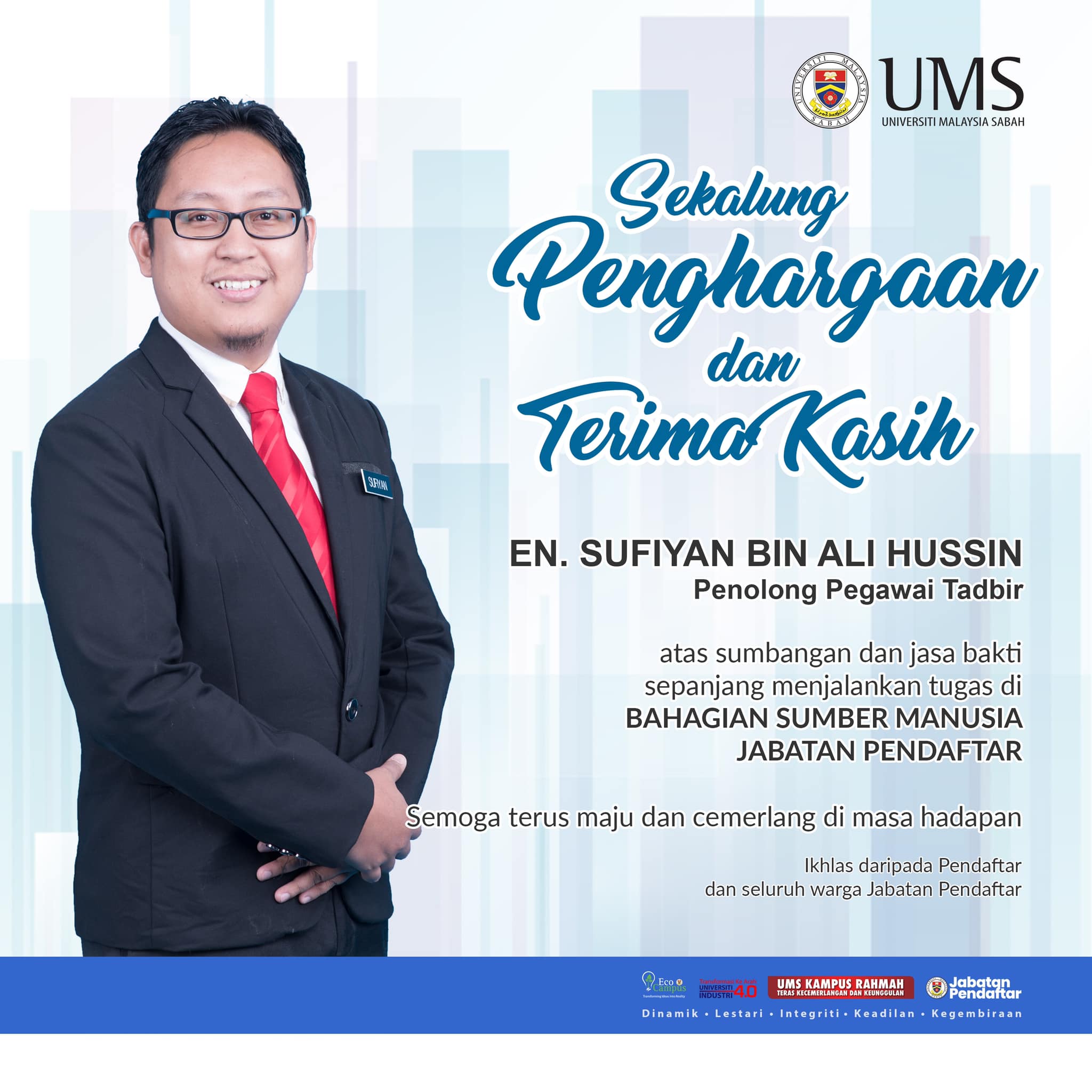 ekalung penghargaan dan terima kasih diucapkan kepada En. Sufiyan Ali Hussin, Penolong Pegawai Tadbir atas sumbangan dan jasa bakti sepanjang menjalankan tugas di Bahagian Sumber Manusia.