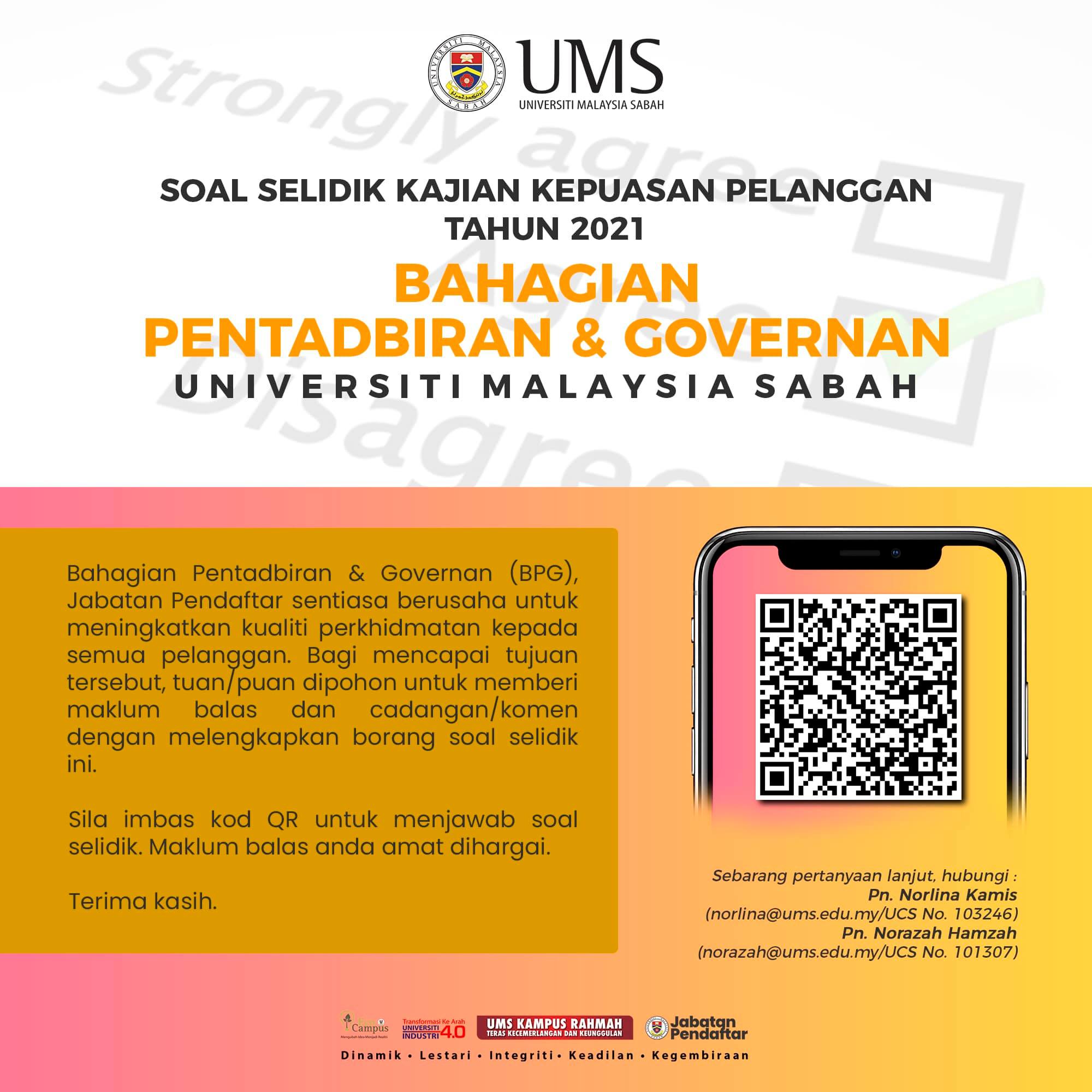 Warga UMS dijemput untuk mengisi borang Soal Selidik Kajian Kepuasan Pelanggan Tahun 2021 Bahagian Pentadbiran & Governan dengan mengimbas kod QR yang disediakan.