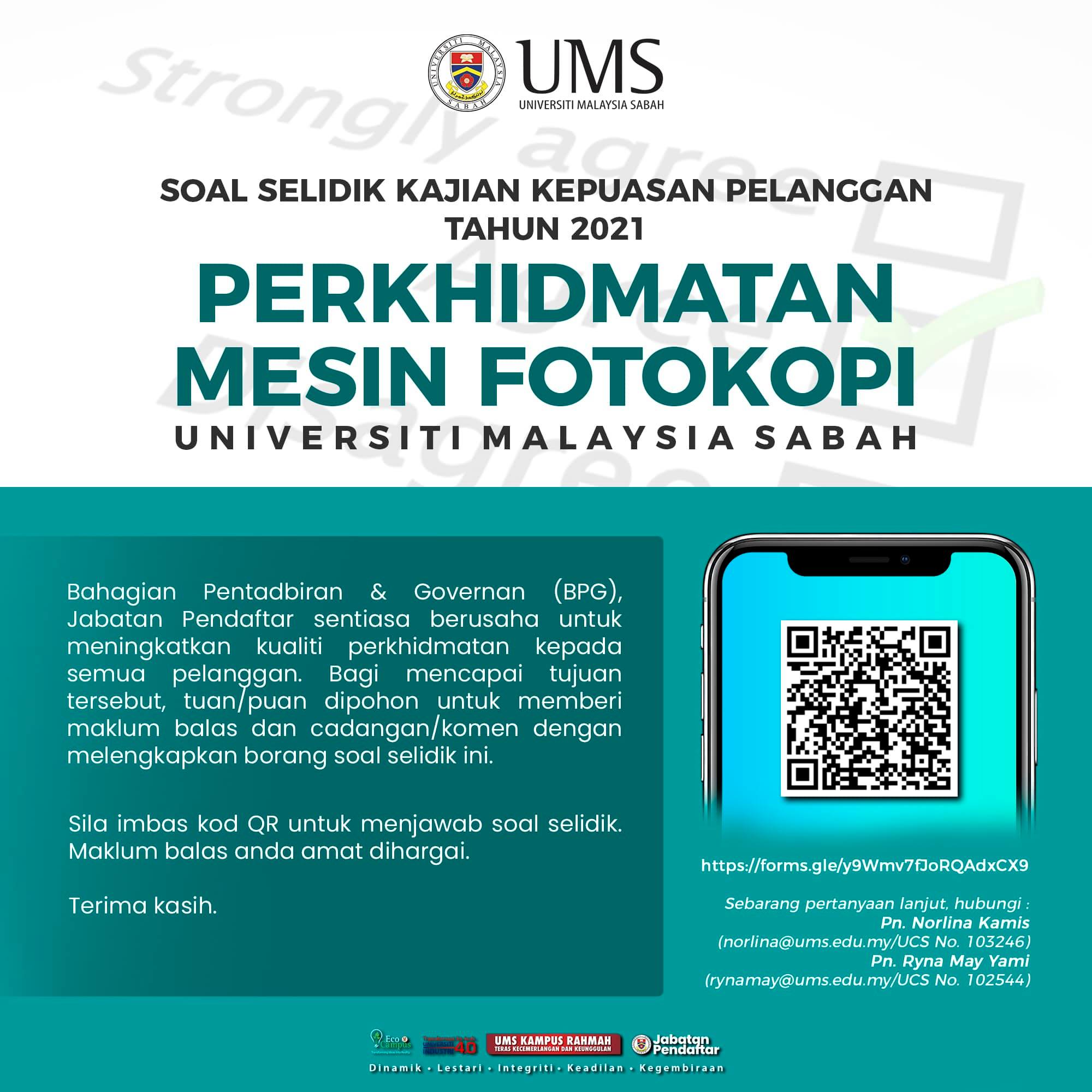 Warga UMS dijemput untuk mengisi borang Soal Selidik Kajian Kepuasan Pelanggan Tahun 2021 Perkhidmatan Mesin Fotokopi UMS dengan mengimbas kod QR yang disediakan.