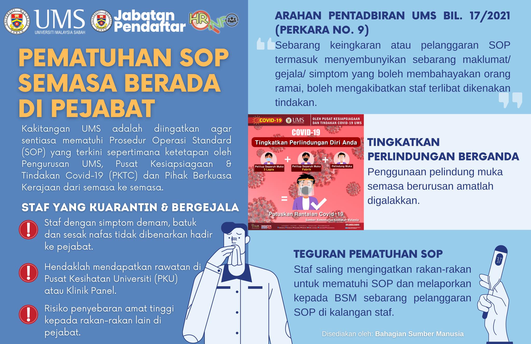 Pematuhan SOP Semasa Berada di Pejabat sebagai peringatan dan hebahan kepada semua kakitangan UMS.