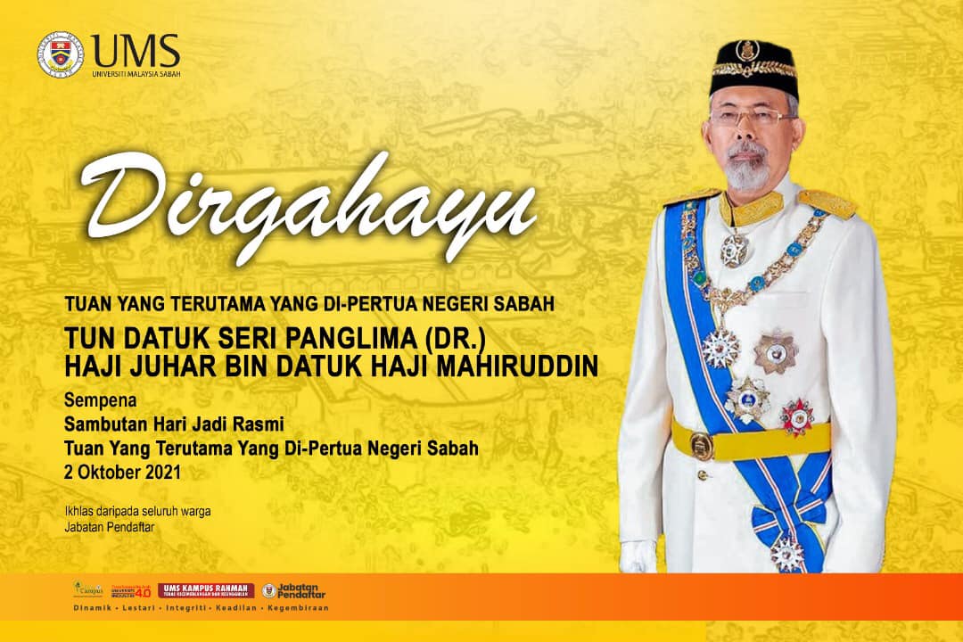 Dirgahayu Tuan YangTerutama Yang Di-Pertua Negeri Sabah Tun Datuk Seri Panglima (Dr.) Haji Juhar bin Datuk Haji Mahiruddin sempena Sambutan Hari Jadi Rasmi Tun Yang Terutama Yang Di-Pertua Negeri Sabah.