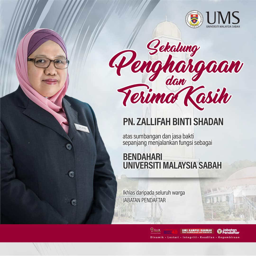 Sekalung penghargaan dan terima kasih diucapkan kepada Puan Zallifah binti Shadan atas sumbangan dan jasa bakti sepanjang menjalankan fungsi sebagai Bendahari, Universiti Malaysia Sabah.