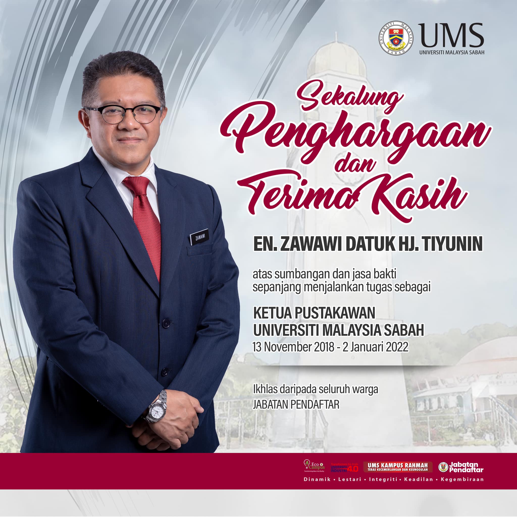 Sekalung penghargaan dan terima kasih diucapkan kepada Encik Zawawi Datuk Haji Tiyunin atas sumbangan dan jasa bakti sepanjang menjalankan tugas sebagai Ketua Pustakawan Universiti Malaysia Sabah.