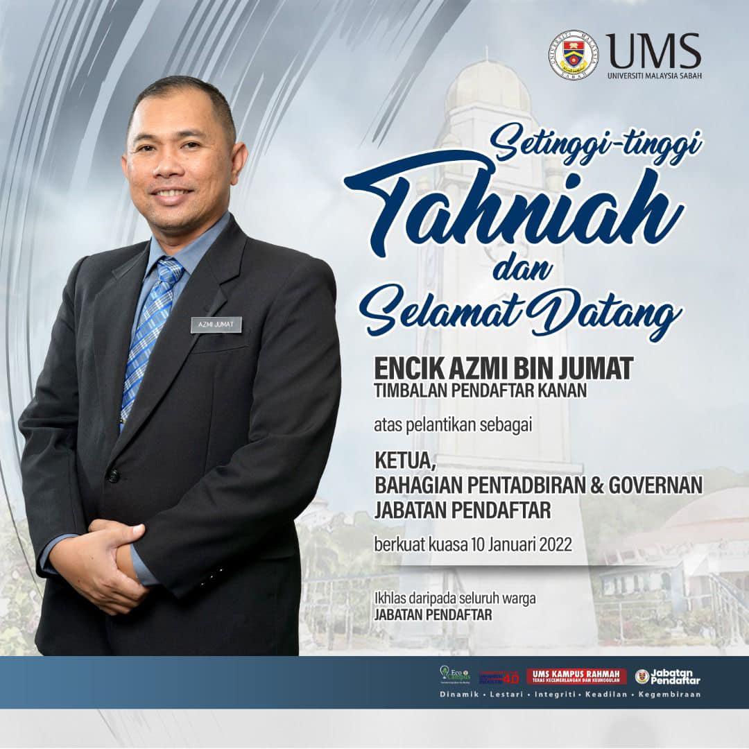 Setinggi-tinggi tahniah dan selamat datang diucapkan kepada Encik Azmi Jumat, Timbalan Pendaftar Kanan atas pelantikan sebagai Ketua Bahagian Pentadbiran & Governan berkuat kuasa pada 10 Januari 2022.