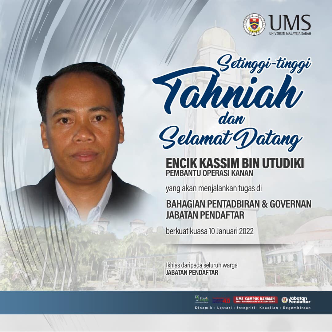 Setinggi-tinggi tahniah dan selamat datang diucapkan kepada Encik Kassim bin Utudiki, Pembantu Operasi Kanan yang akan menjalankan tugas di Bahagian Pentadbiran & Governan berkuat kuasa pada 10 Januari 2022.