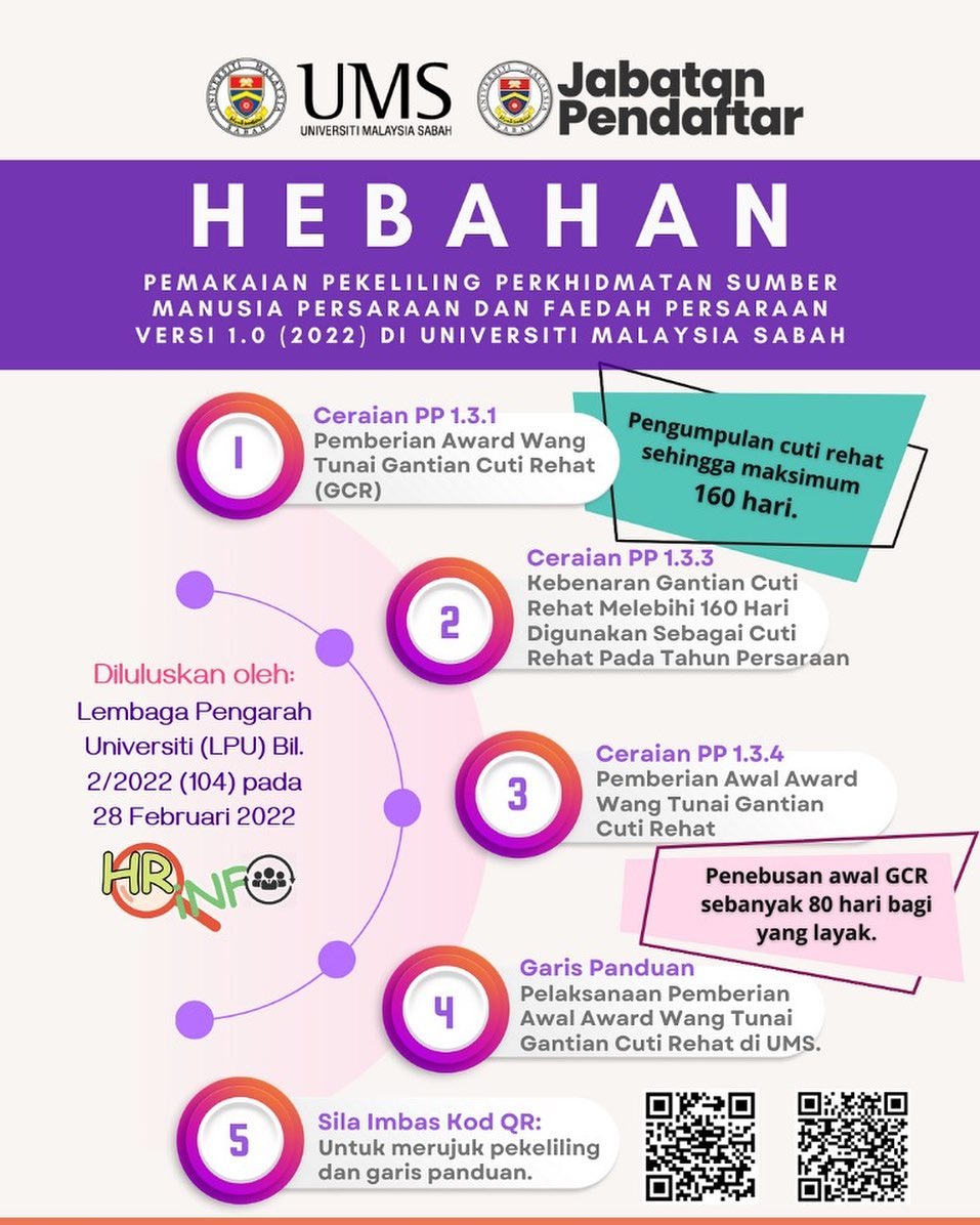 Sukacita dimaklumkan bahawa, pemakaian Pekeliling Perkhidmatan Sumber Manusia (PPSM) - Persaraan Dan Faedah Persaraan Versi 1.0 (2022) telah diluluskan oleh Lembaga Pengarah Universiti (LPU) Bil. 2/2022 (104) pada 28 Februari 2022. Kelulusan ini adalah berkaitan pengumpulan cuti rehat sehingga maksimum 160 hari dan penebusan awal award gantian cuti rehat (GCR) sebanyak 80 hari bagi kakitangan yag layak serta memenuhi syarat.
