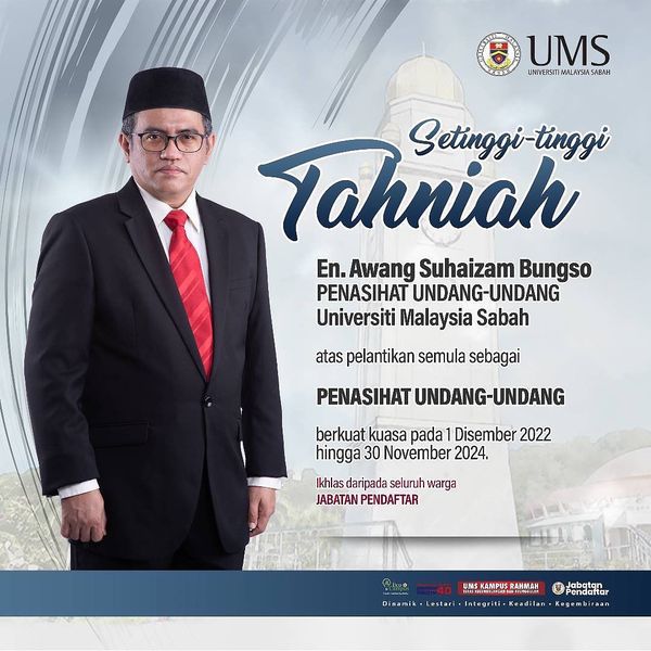 Setinggi-tinggi tahniah diucapkan kepada En. Awang Suhaizam Bungso atas pelantikan semula sebagai Penasihat Undang-Undang, Universiti Malaysia Sabah berkuat kuasa pada 1 Disember 2022 hingga 30 November 2024.