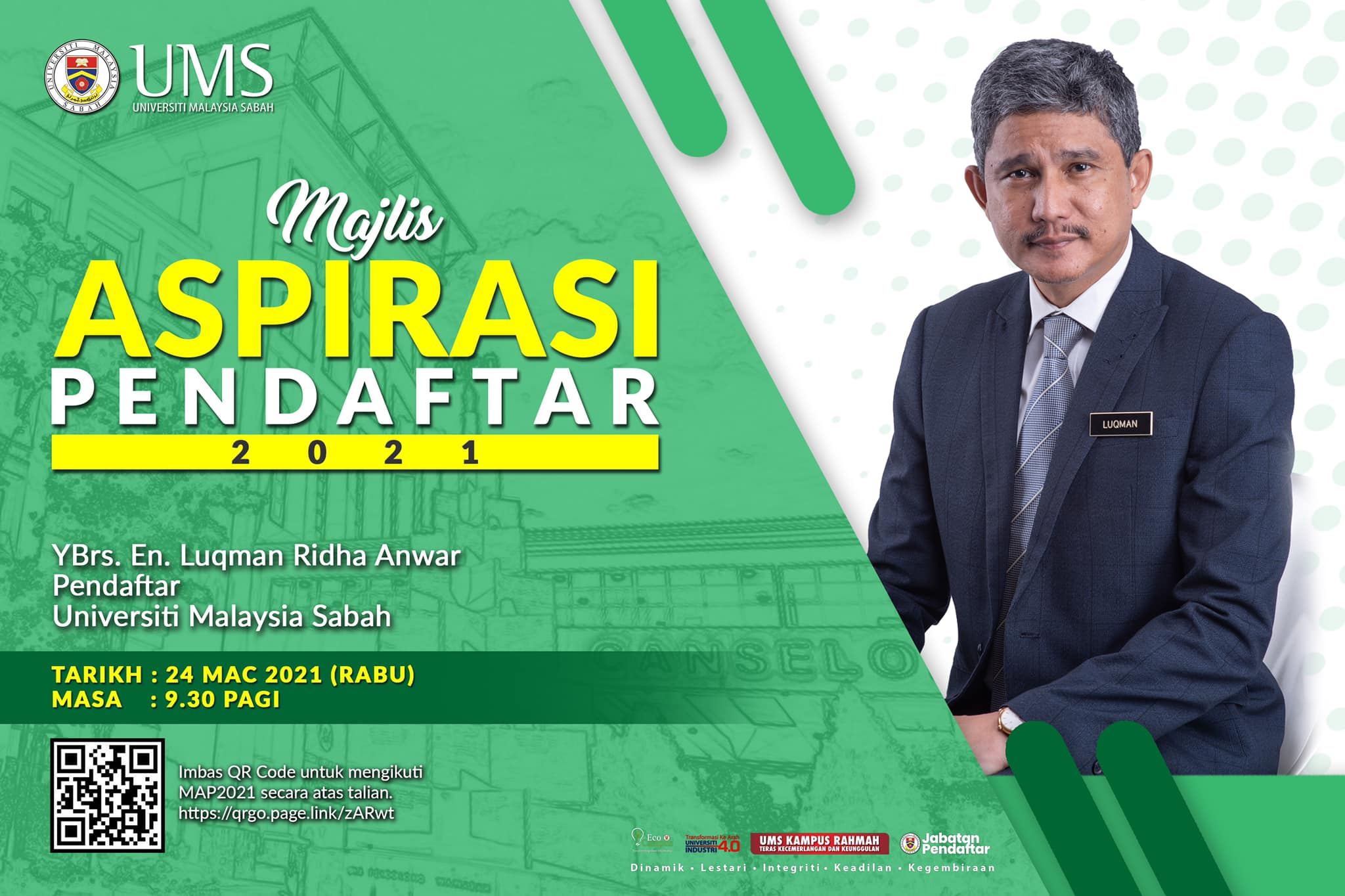 Majlis Aspirasi Pendaftar Tahun 2021 (MAP2021) akan diadakan pada 24 Mac 2021 (Rabu) jam 9.30 pagi secara atas talian menerusi pautan Webex.
