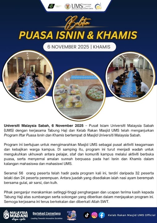Universiti Malaysia Sabah, 6 November 2025 – Pusat Islam Universiti Malaysia Sabah (UMS) dengan kerjasama Tabung Haji dan Kelab Rakan Masjid UMS telah menganjurkan Program Iftar Puasa Isnin dan Khamis bertempat di Masjid Universiti Malaysia Sabah.