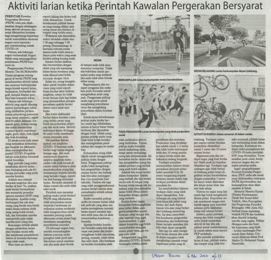 06 November 2020 Jumlah paparan: 2322 Aktiviti Larian Ketika Perintah Kawalan Pergerakan Bersyarat Cetak Emel UTUSAN BORNEO, 6 MEI 2020, MS 15