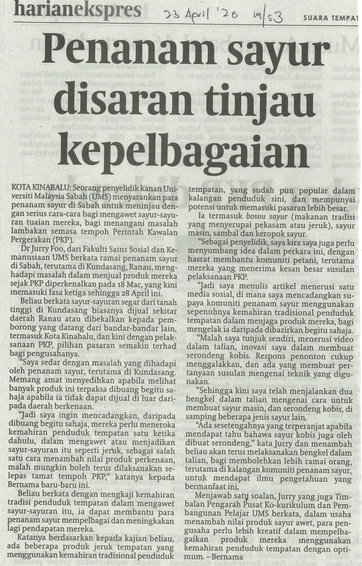 06 November 2020 Jumlah paparan: 2012 Penanam Sayur Disaran Tinjau Kepelbagaian Cetak Emel HARIAN EKSPRES, 23 APRIL 2020, MS 3