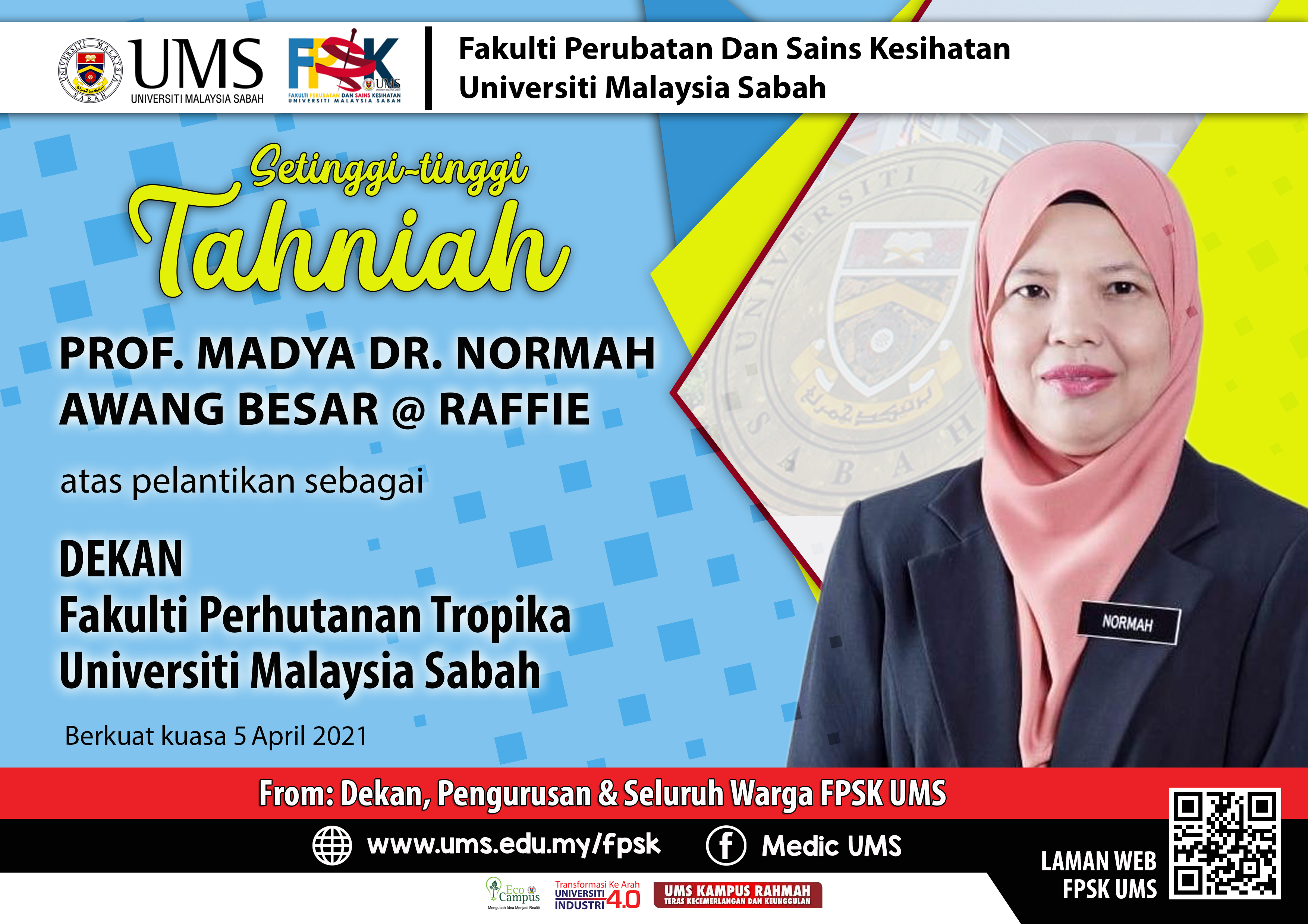 12 April 2021 Jumlah paparan: 2955 Ucapan Tahniah Kepada Prof. Madya Dr. Normah Awang Besar @ Raffie Cetak Emel Ucapan Daripada: Pusat Pengurusan NR dan Fasiliti Perumahan Pelajar (PNRF) | Fakulti Perubatan dan Sains Kesihatan (FPSK)