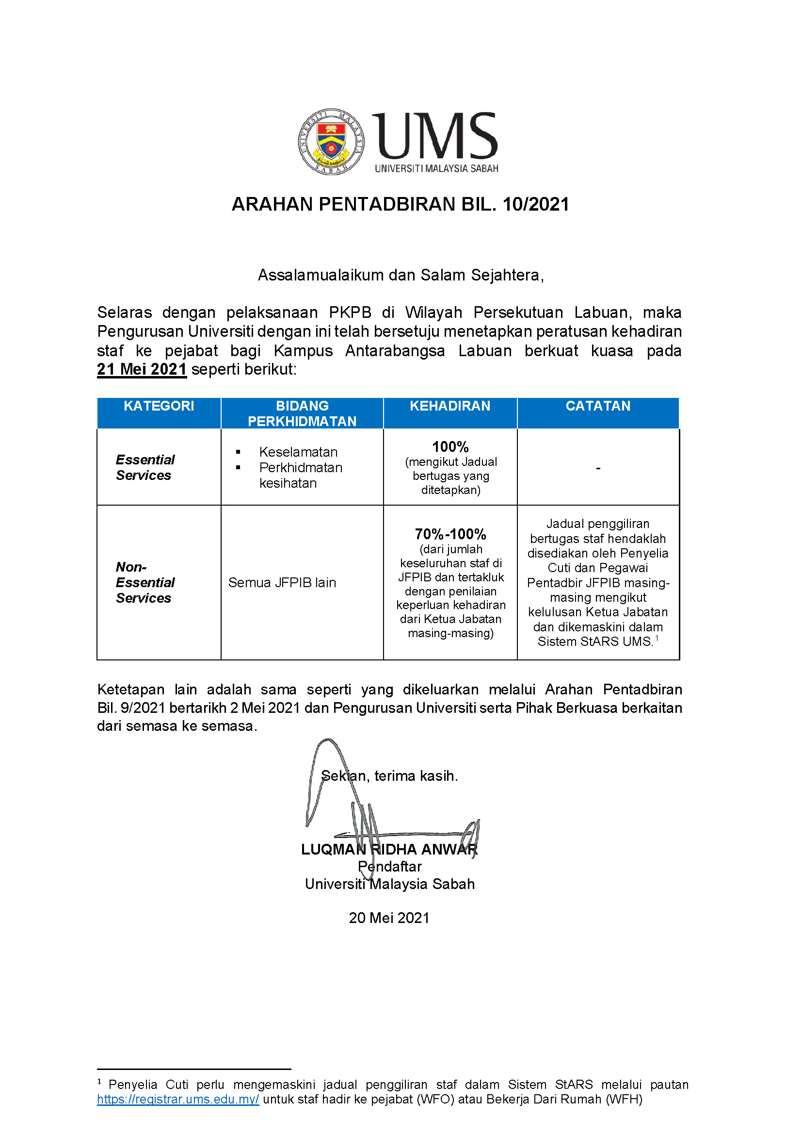 20 Mei 2021 Jumlah paparan: 2645 Arahan Pentadbiran Bil. 10 Tahun 2021 Cetak Emel Pengumuman Daripada: Jabatan Pendaftar, UMS