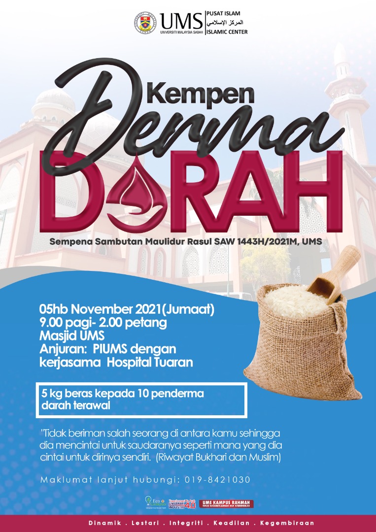 03 November 2021 Jumlah paparan: 1309 Kempen Derma Darah Sempena Sambutan Maulidur Rasul SAW 1443H/2021M Cetak Emel Pengumuman Daripada: Pusat Islam, UMS