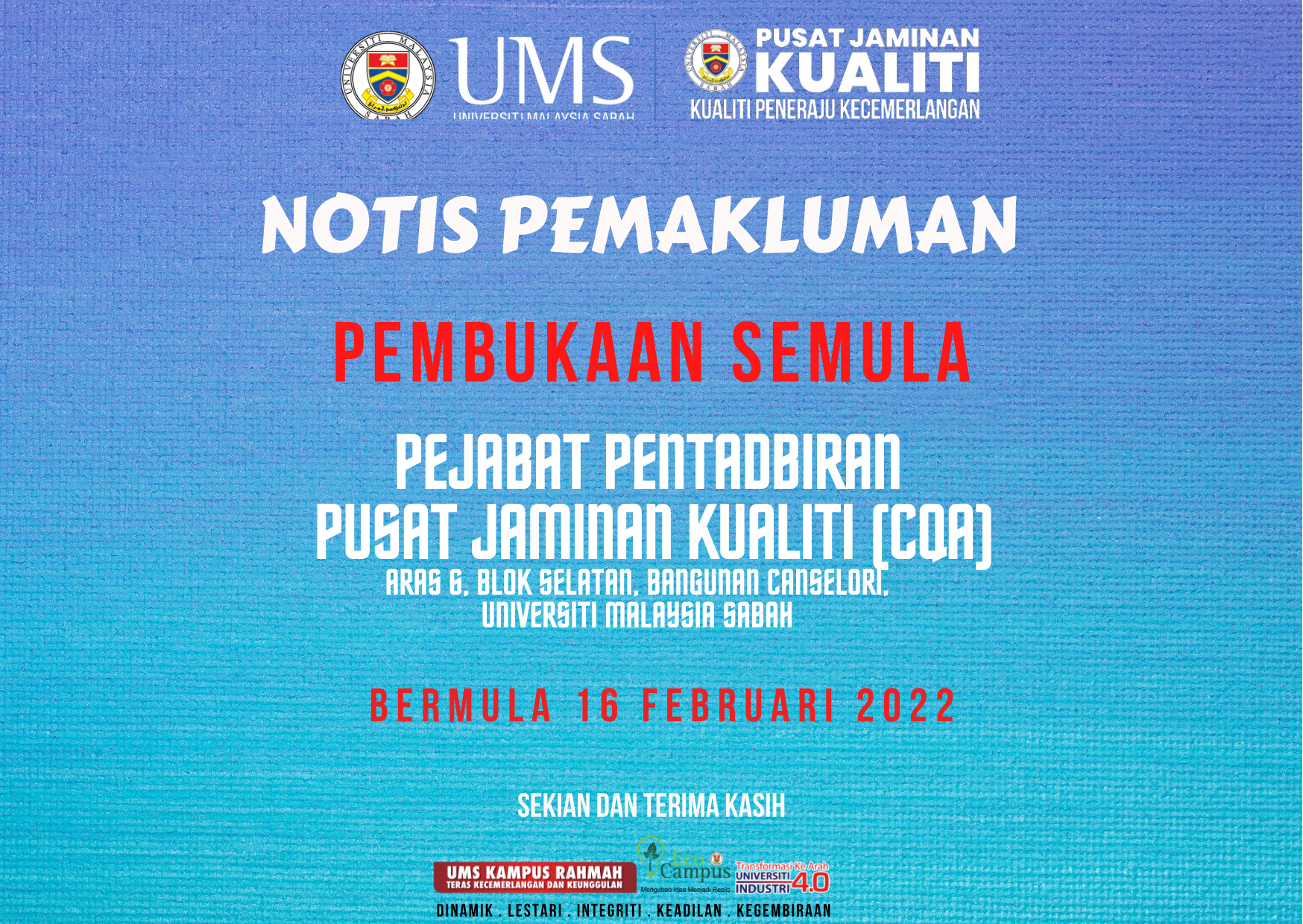 16 Februari 2022 Jumlah paparan: 1024 Notis Pemakluman Pembukaan Semula Pejabat Pentadbiran Pusat Jaminan Kualiti Cetak Emel Pengumuman Daripada: Pusat Jaminan Kualiti, UMS