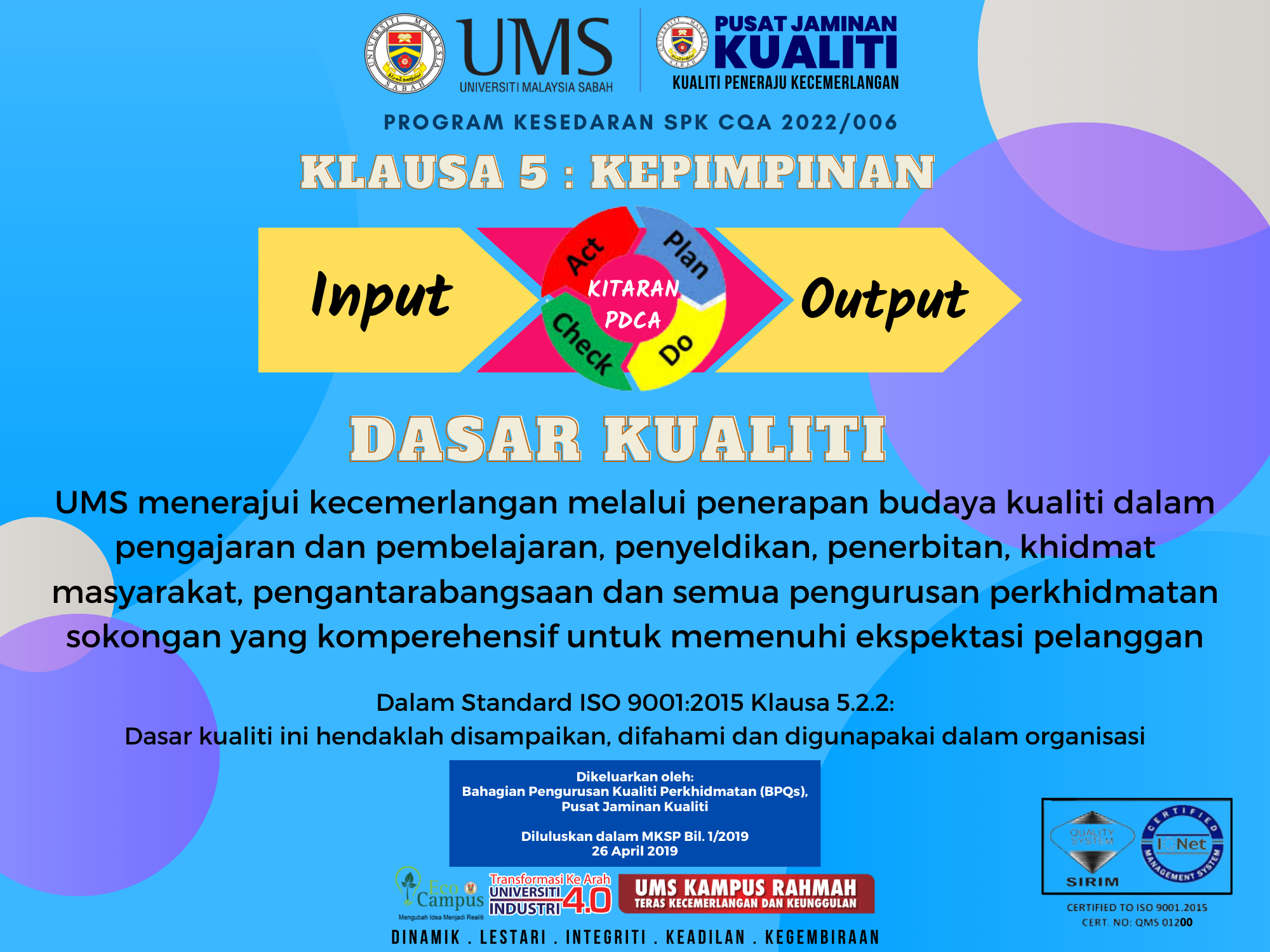 17 Februari 2022 Jumlah paparan: 1048 Program Kesedaran SPK CQA 2022/006 Klausa 5 : Kepimpinan Cetak Emel Pengumuman Daripada: Pusat Jaminan Kualiti, UMS