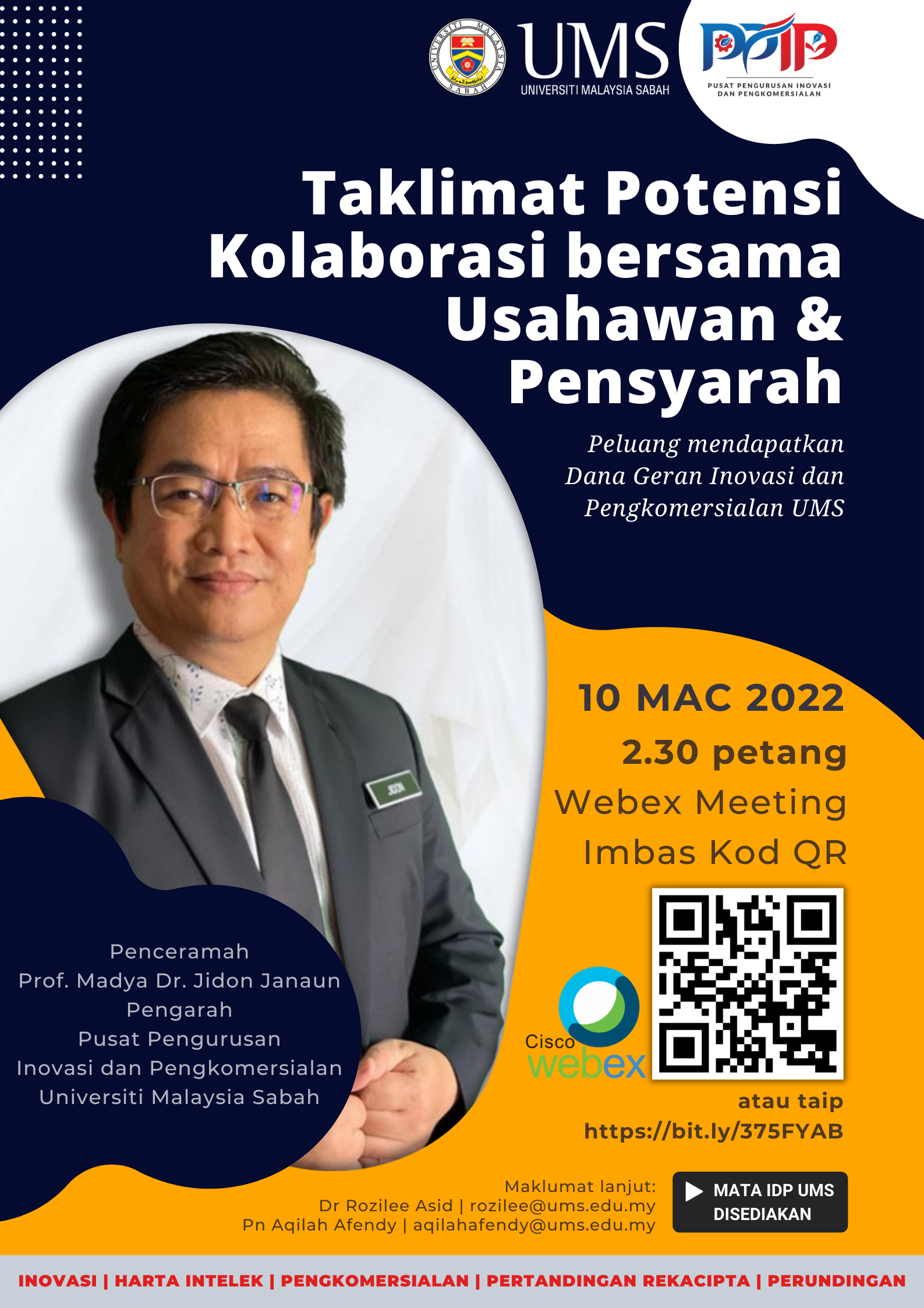 Taklimat Potensi Kolaborasi bersama Usahawan dan Pensyarah | 10 Mac 2022 | 2.30 -4.30 petang | Webex | Usahawan (TERBUKA)/ Pensyarah |