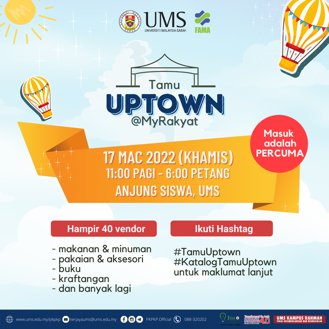 Dengan segala hormatnya dijemput hadir ke TAMU UPTOWN@MYRAKYAT, iaitu tamu mingguan anjuran Pusat Kerjaya dan Pembangunan Keusahawanan Pelajar bersama FAMA Negeri Sabah . Masuk adalah secara PERCUMA.