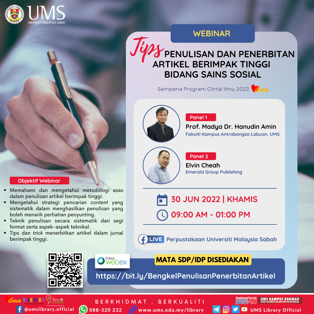 Sertai kami dalam Webinar : Tips Penulisan dan Penerbitan Artikel Berimpak Tinggi Bidang Sains Sosial bersempena dengan Program Cintai Ilmu bersama Prof. Madya Dr. Hanudin Amin.