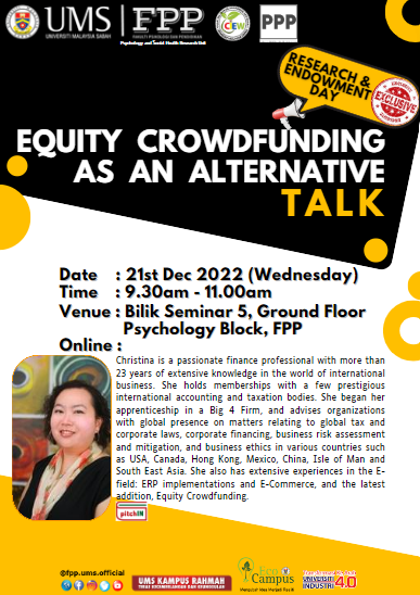 Sukacita dimaklumkan bahawa sesi taklimat ‘EQUITY CROWDFUNDING AS AN ALTERNATIVE TALK’ akan diadakan seperti ketetapan berikut:-
