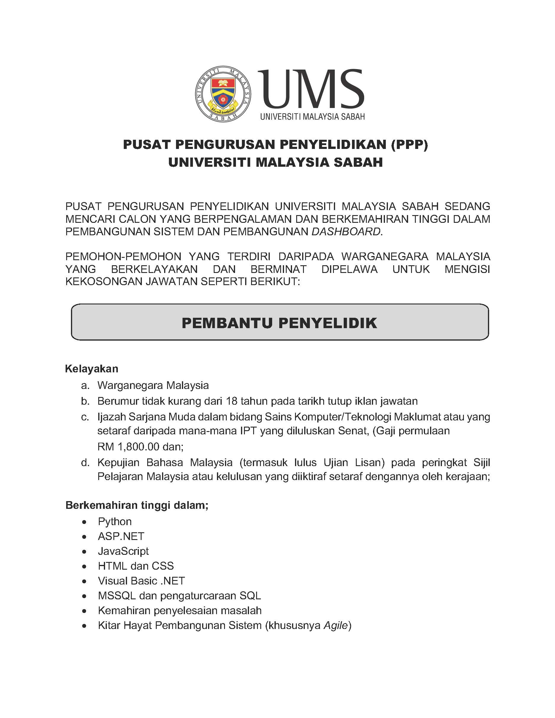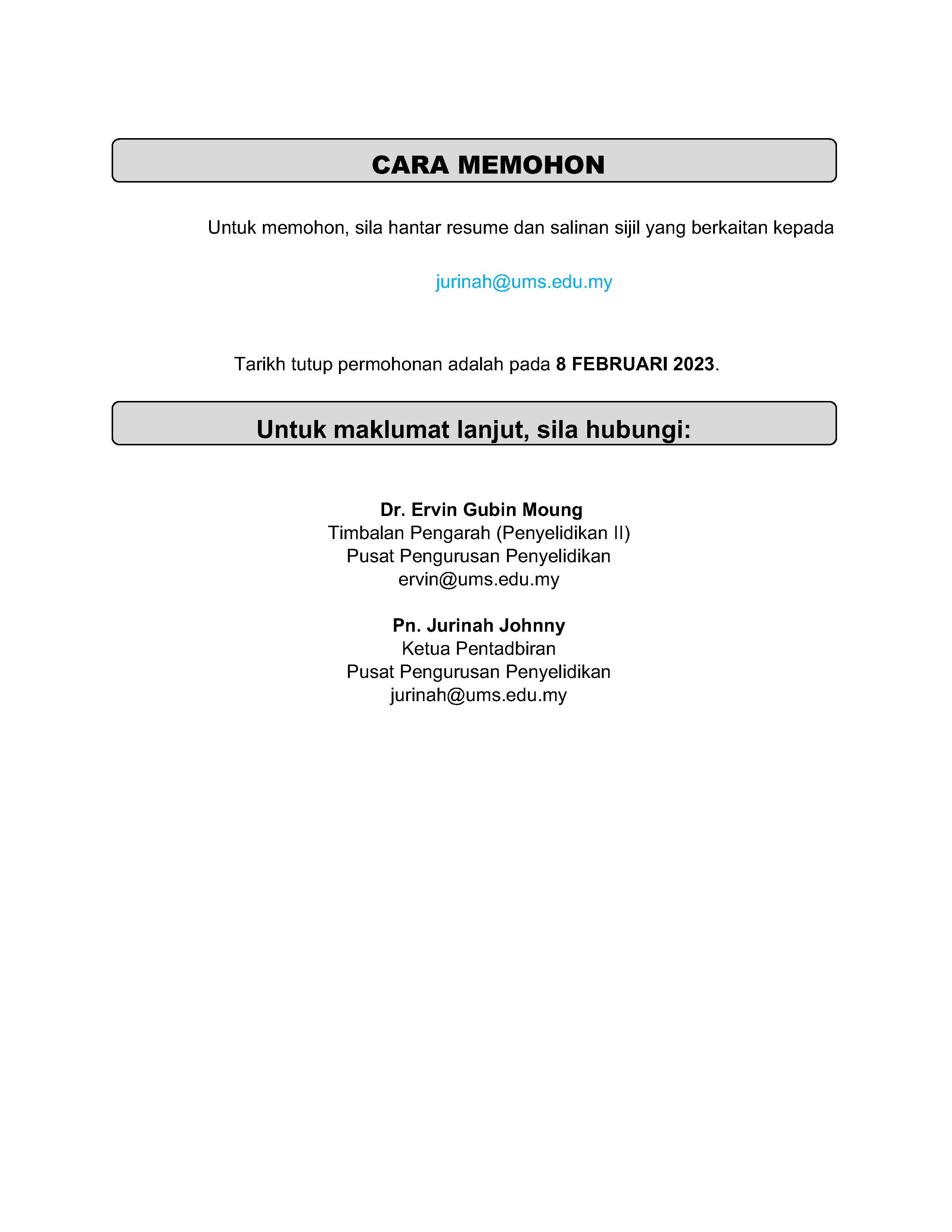 30 Januari 2023 Jumlah paparan: 2883 Iklan Dalaman Kekosongan Jawatan Pegawai Penyelidik Gred Q41 dan Pembantu Penyelidik Cetak Emel Pengumuman Daripada: Pusat Pengurusan Penyelidikan