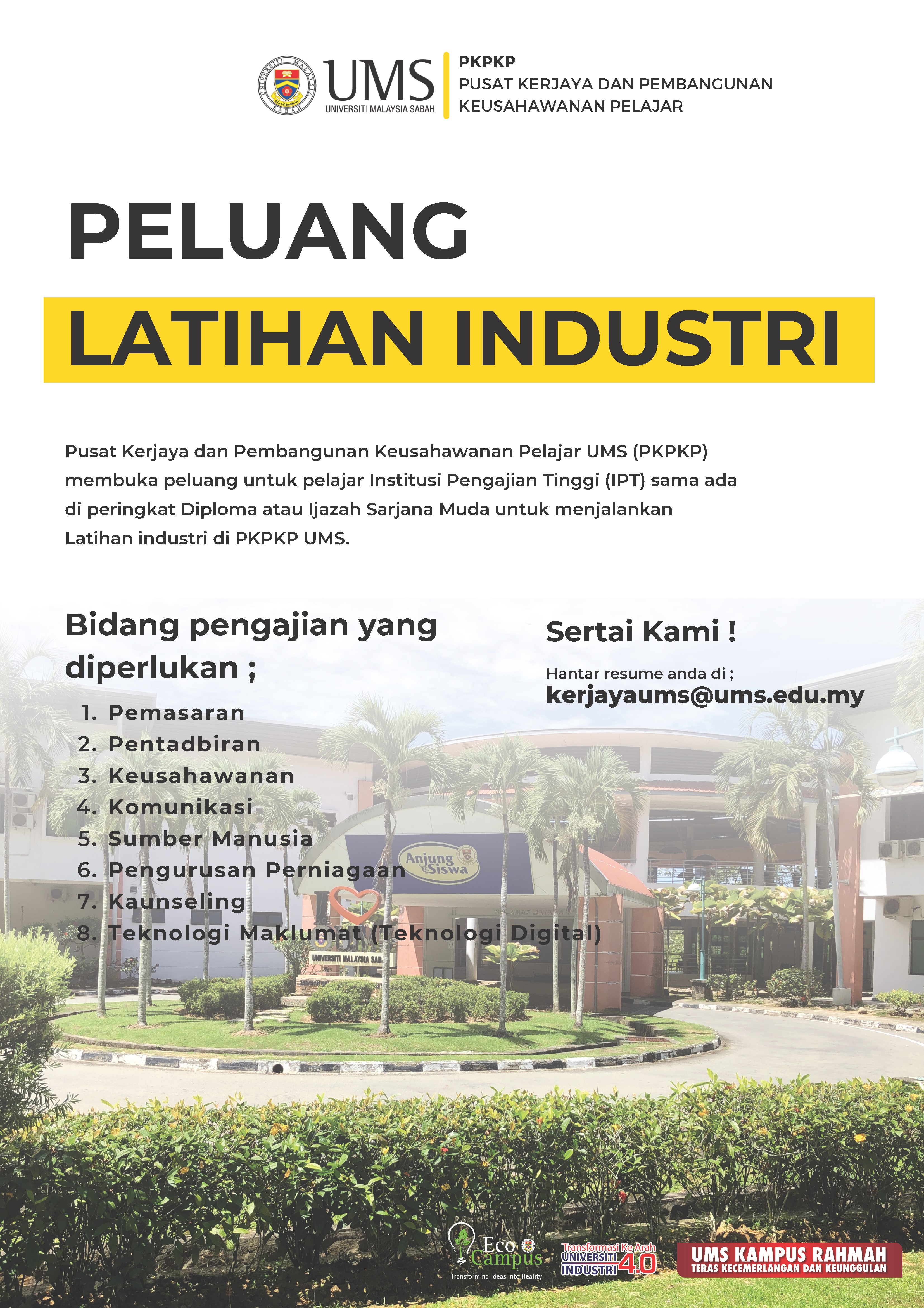 Sukacita dimaklumkan Pelajar Institusi Pengajian Tinggi (IPT) sama ada di peringkat Diploma atau Ijazah Sarjana Muda yang akan menjalani Latihan industri pada semester seterusnya adalah dipelawa untuk menjalani latihan industri di Pusat Kerjaya dan Pembangunan Keusahawanan Pelajar UMS (PKPKP). Penempatan pelajar latihan industri di Sektor/Unit adalah disesuaikan mengikut bidang pengajian yang dipelajari.