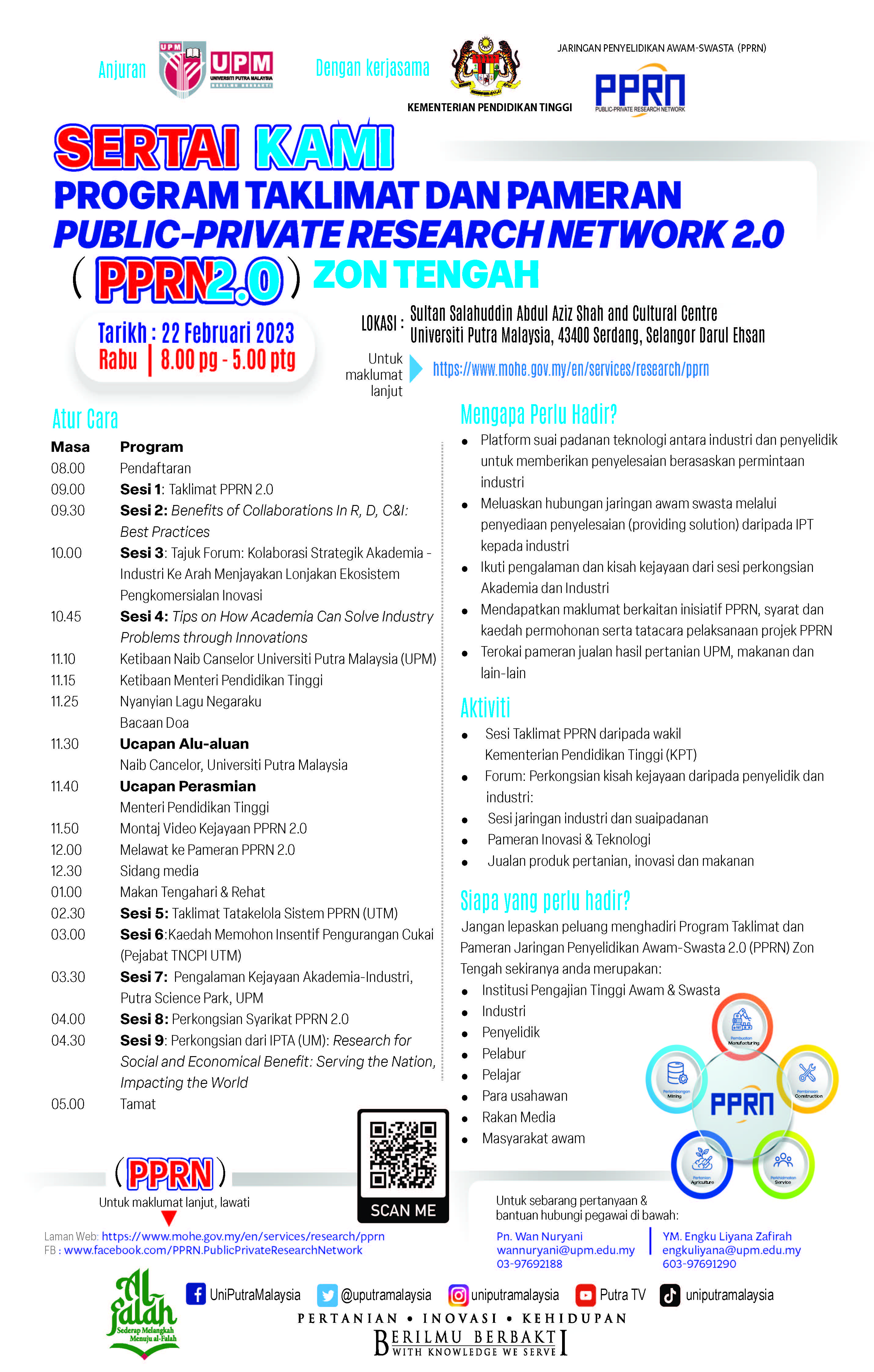 2. Sukacita dimaklumkan bahawa Universiti Putra Malaysia dengan kerjasama Bahagian Dasar dan Penyelidikan, Kementerian Pendidikan Tinggi akan menganjurkan Program Taklimat dan Pameran Public-Private Research Network 2.0 Zon Tengah seperti butiran berikut: