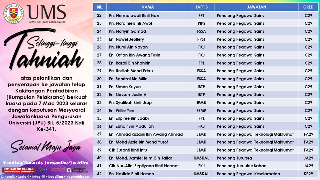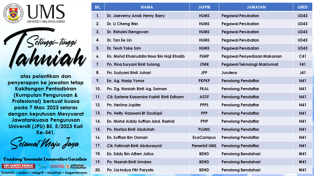 12 April 2023 Jumlah paparan: 3102 Pemakluman Kenaikan Pangkat dan Penyerapan ke Jawatan Tetap Kakitangan Pentadbiran Cetak Emel Pengumuman Daripada: Bahagian Pengurusan Sumber Manusia