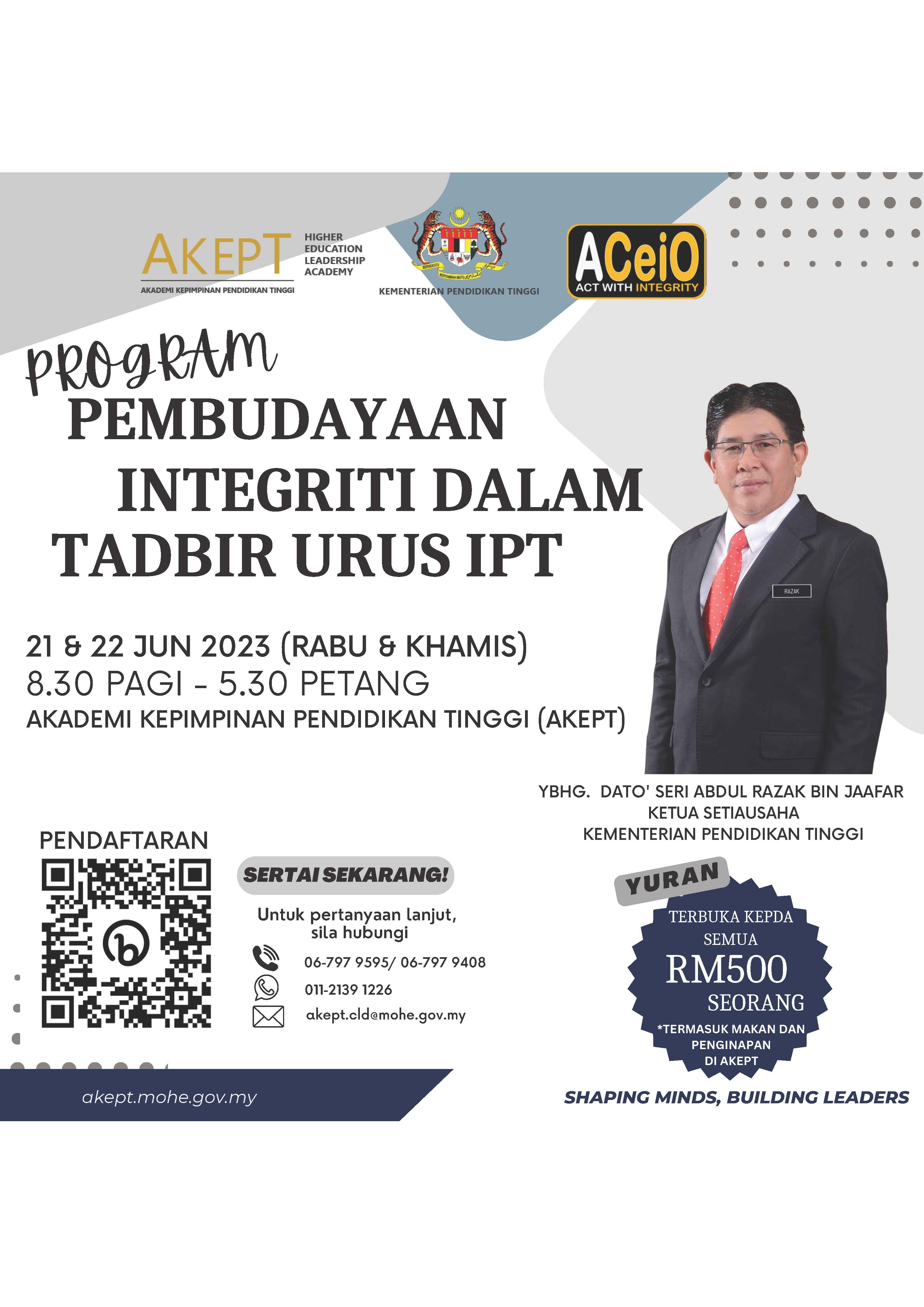 - Sukacita dimaklumkan bahawa Akademi Kepimpinan Pendidikan Tinggi (AKEPT) dengan kolaborasi Persatuan Pegawai Integriti Bertauliah Malaysia (ACeIO) akan mengadakan Program Pembudayaan Integriti dalam Tadbir Urus Institusi Pendidikan Tinggi (PITI). Antara objektif pelaksanaan program ini adalah untuk memantapkan konsep pembudayaan integriti dalam konteks tadbir urus Institusi Pendidikan Tinggi (IPT) serta mengintegrasikan konsep tersebut dengan inisiatif dan hala tuju dalam kepimpinan IPT. Program ini menyasarkan pemimpin dan pentadbir pada semua peringkat ekosistem IPT.