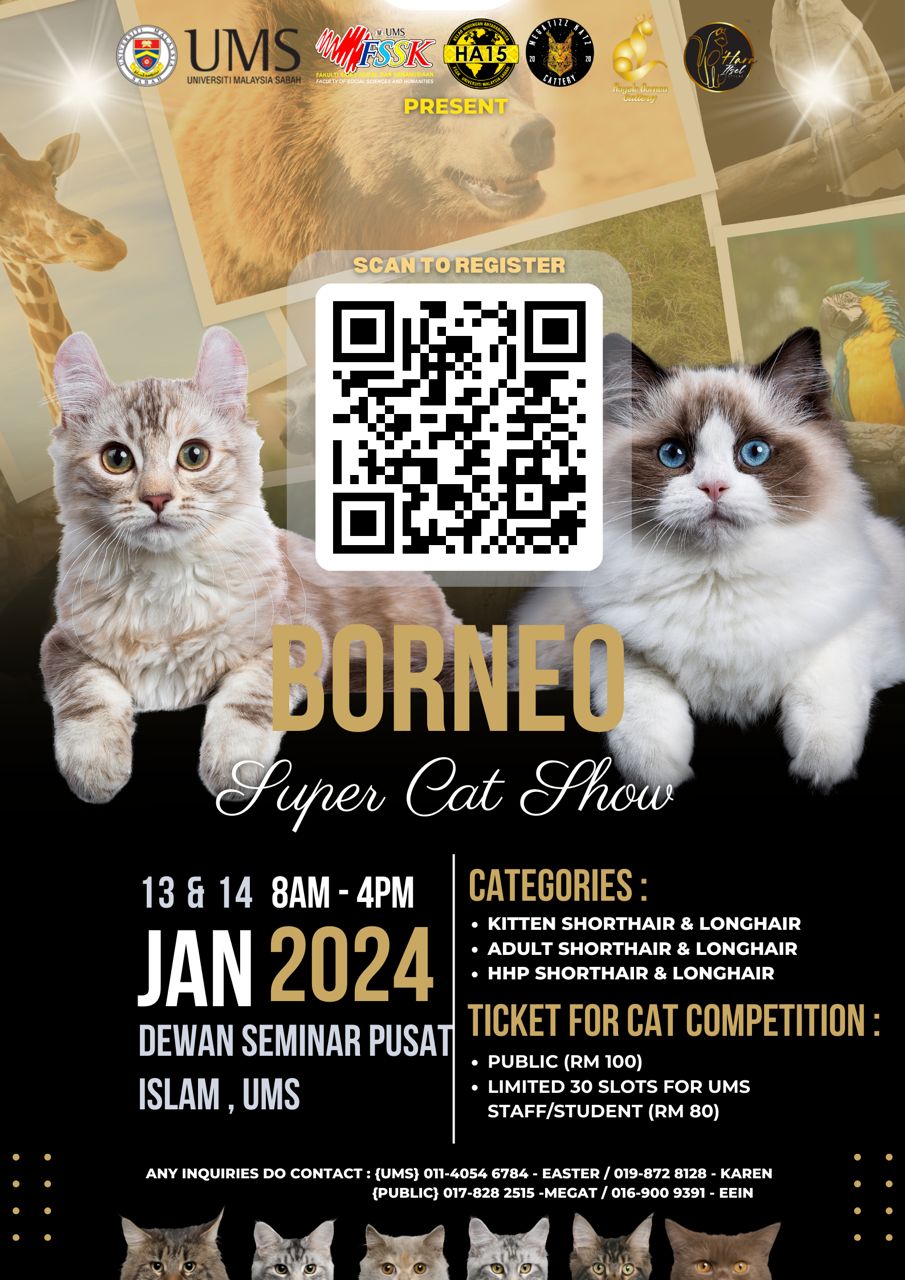 Sukacita dimaklumkan bahawa Kelab Hubungan Antarabangsa Universiti Malaysia Sabah dengan kerjasama Fakulti Pertanian Lestari UMS Kampus Sandakan dan Kelab Kucing Hot Borneo akan mengadakan pertandingan Borneo Super Cat Show pada ketetapan berikut: