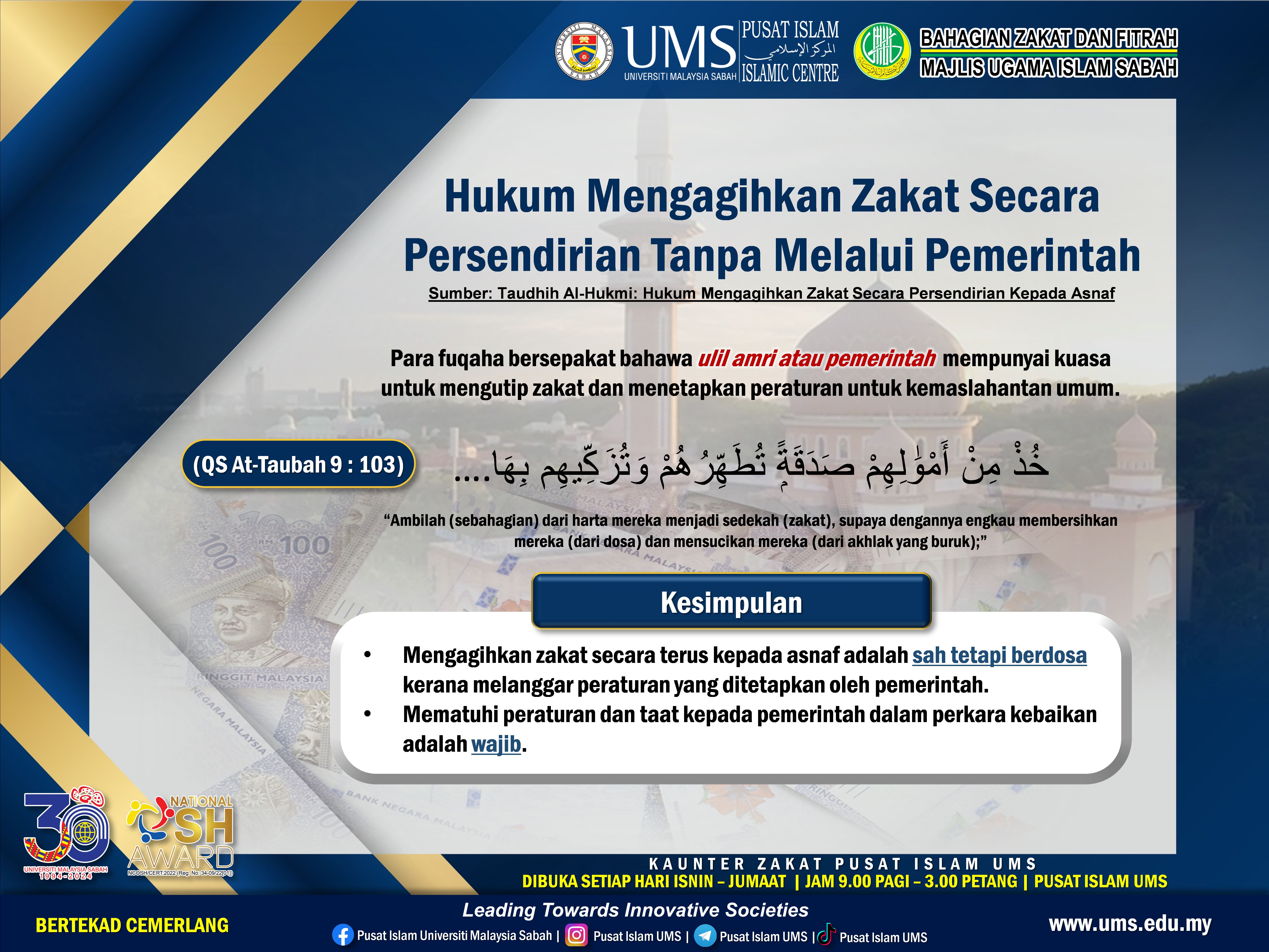 05 Februari 2024 Jumlah paparan: 647 Hukum Mengagihkan Zakat Secara Persendirian Tanpa Melalui Pemerintah Cetak Emel Pengumuman Daripada: Sektor Pendidikan dan Zakat, Pusat Islam UMS