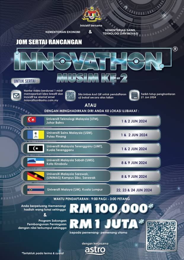 24 Mei 2024 Jumlah paparan: 673 Hebahan Innovathon Inisiatif Bersama Kementerian Ekonomi dan Kementerian Sains, Teknologi dan Inovasi dengan Kerjasama Astro Cetak Emel Pengumuman Daripada: Pusat Pengurusan Penyelidikan
