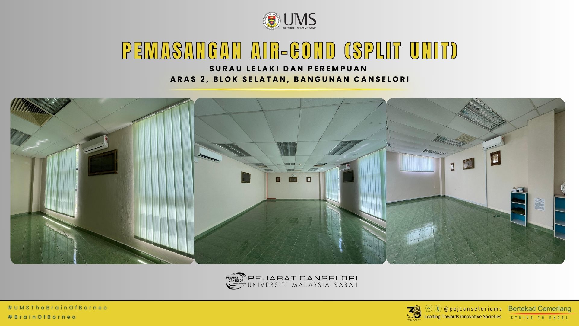 Dimaklumkan bahawa kerja-kerja Pemasangan Air-Cond (Split Unit) di Surau Lelaki dan Wanita Aras 2, Blok Selatan, Bangunan Canselori telah selesai pada 19 Mei 2025 yang diselaras dan dipantau oleh Pejabat Canselori.